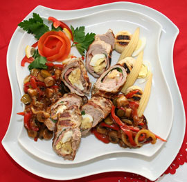 Mușchiulețul îl batem subțire pentru rulou, apoi îl umplem cu bacon, cașcaval, ou, salată verde, după care îl dăm pe grătarul încins 10 – 15 minute. Legumele tăiate julien le tragem la tigaie din care formăm sosul.