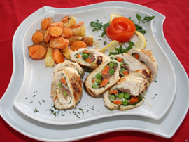 Pieptul de pui se pregătește pentru rulou după care îl umplem cu spanac, prosciuto, cașcaval, morcov, mazăre, după care îl dăm pe grătar 10-15 minute. Ca și garnituri vă recomandăm cartofi caval cu sote de morcov.