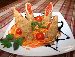 3. Așezați pe farfurie legumele julien împreună cu roșiile cherry, rulourile de șalău cu susan tăiate în două și ornați cu sosul de aceto balsamico.