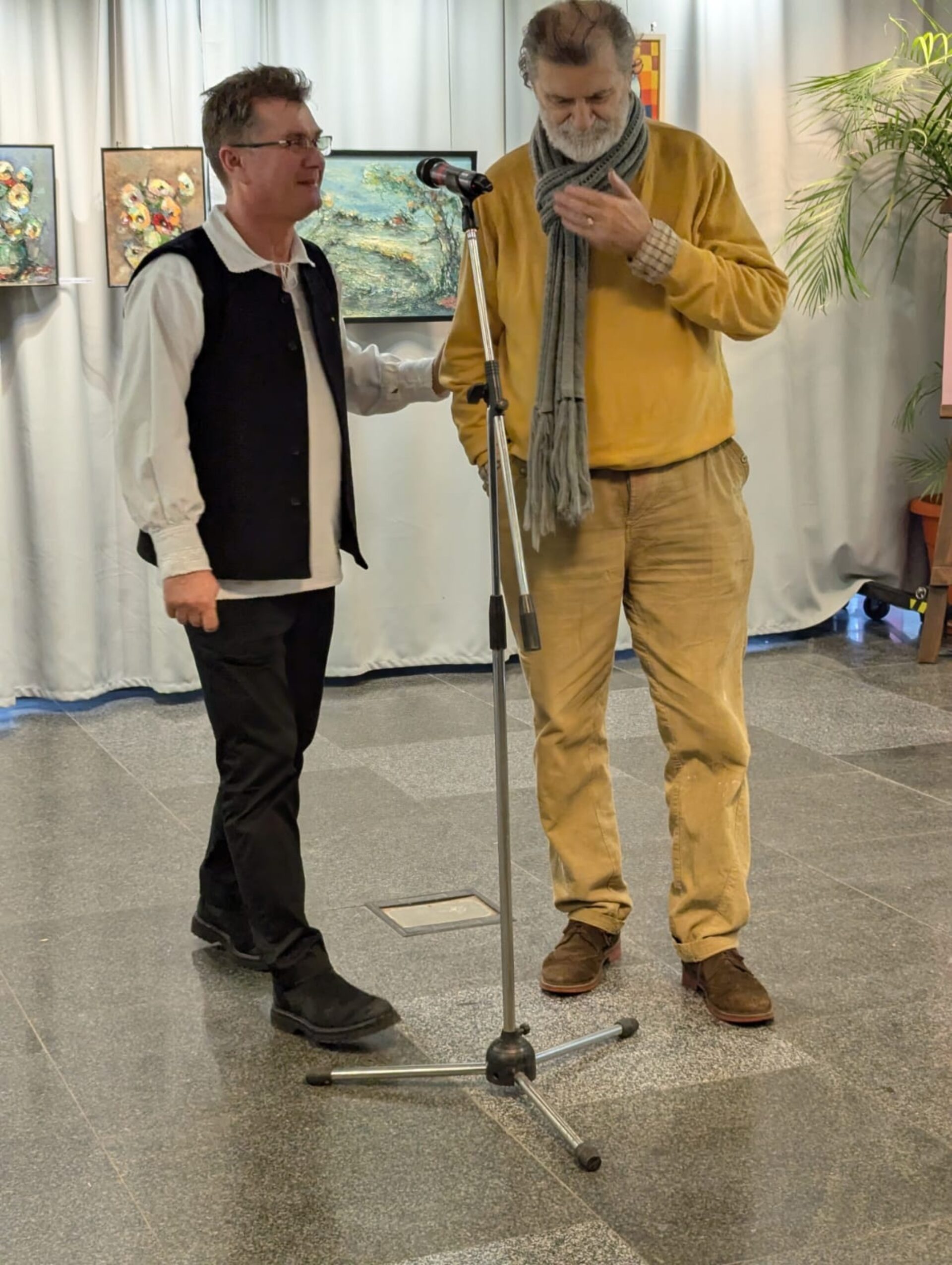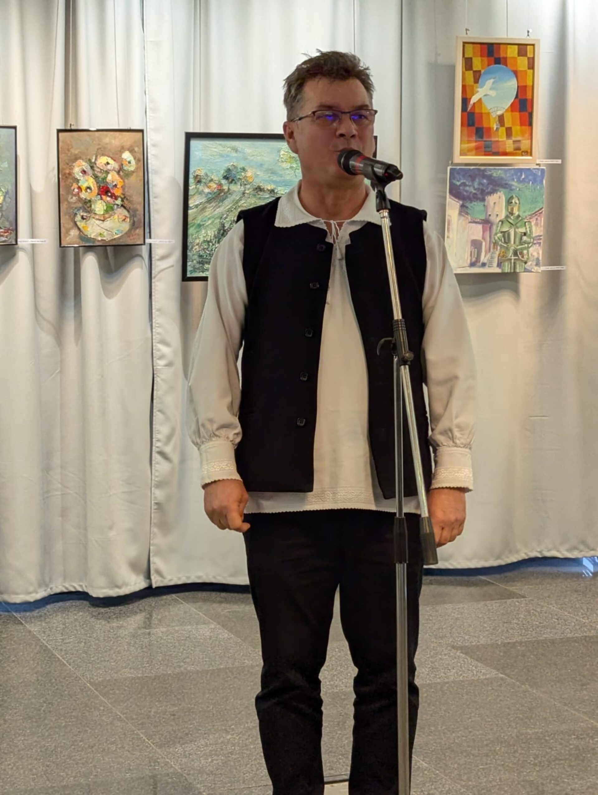 Gazda evenimentului, directorul Centrului Cultural Bucovina, Călin Brăteanu, le-a urat „La mulți ani!” sărbătoriților zilei, Vasile, Grigore și Ioan, dar și artiștilor, pentru că expoziția s-a vernisat de ziua artiștilor plastici bucovineni.