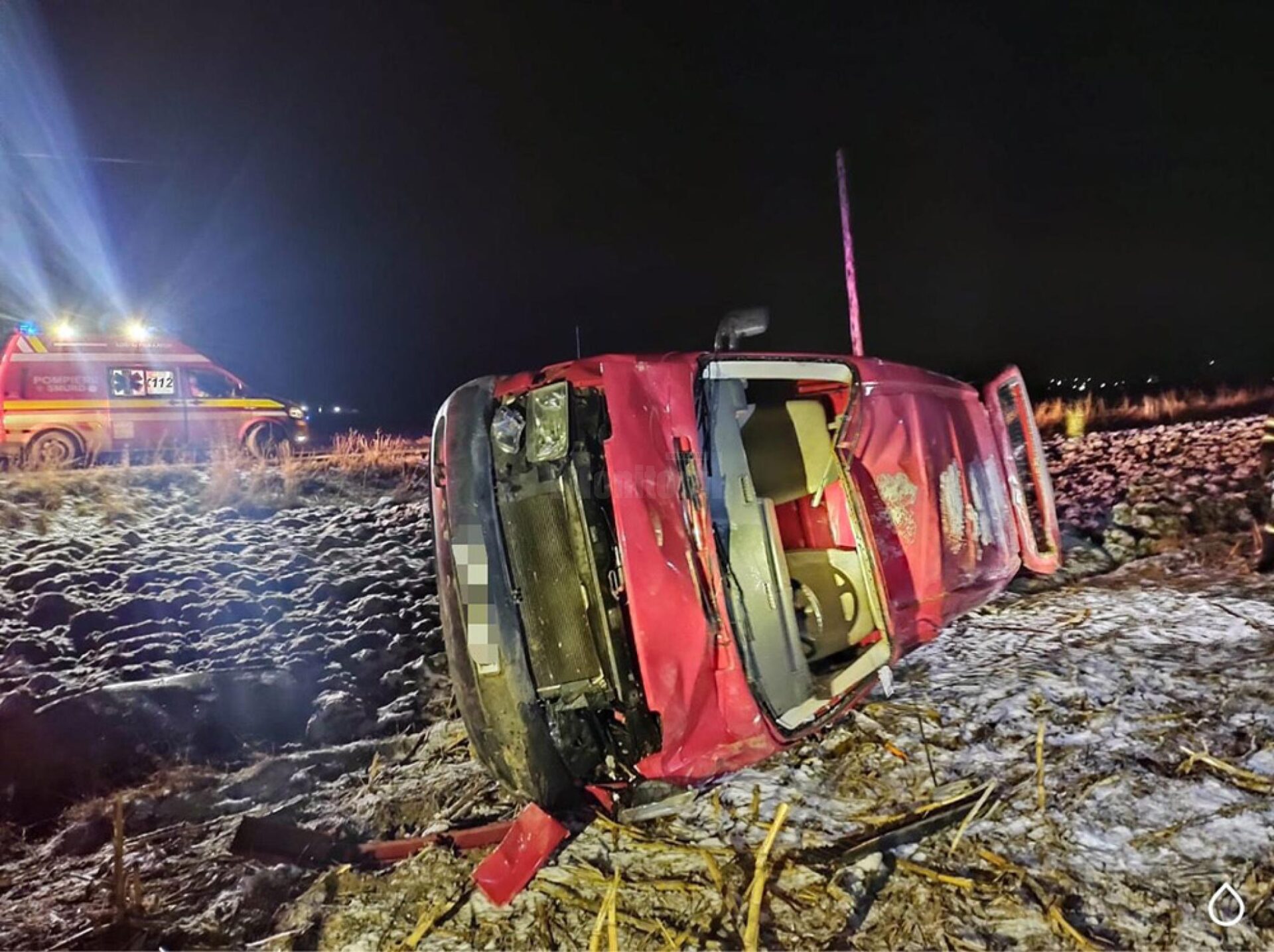 S-a răsturnat cu autoutilitara pe o porțiune de drum drept, pe carosabilul ud