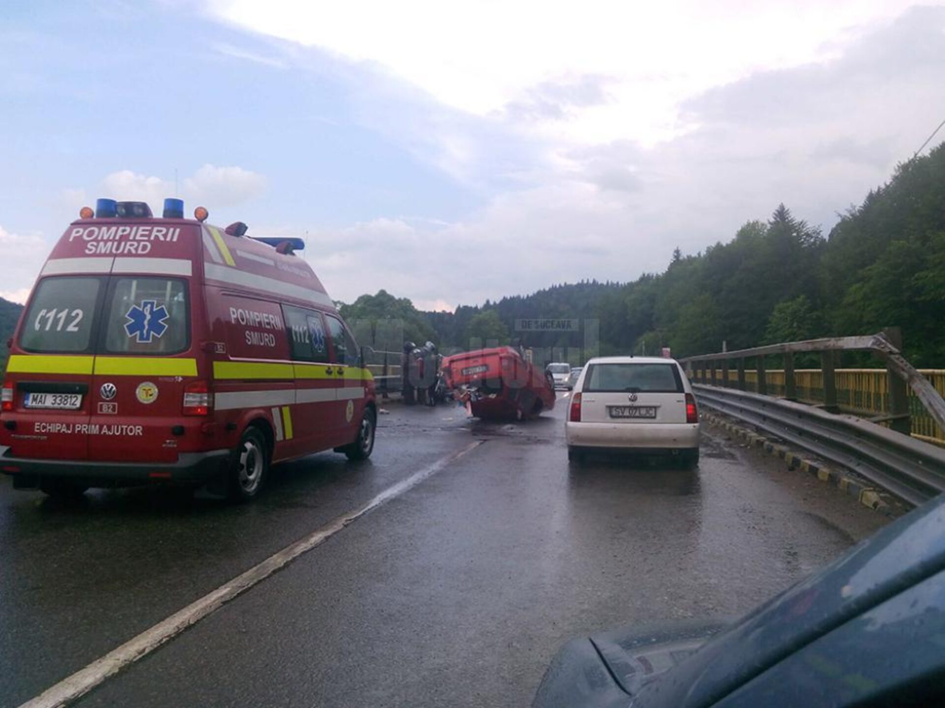 Un bărbat în vârstă de 57 de ani a trecut prin momente de coșmar după ce a scăpat de sub control mașina pe care o conducea și s-a răsturnat pe un pod de pe DN 17, pe raza satului Molid, comuna Vama. Accidentul s-a petrecut duminică, în jurul orei 16.30, când DN 17 avea aderență scăzută, carosabilul fiind ud în urma unei ploi torențiale.