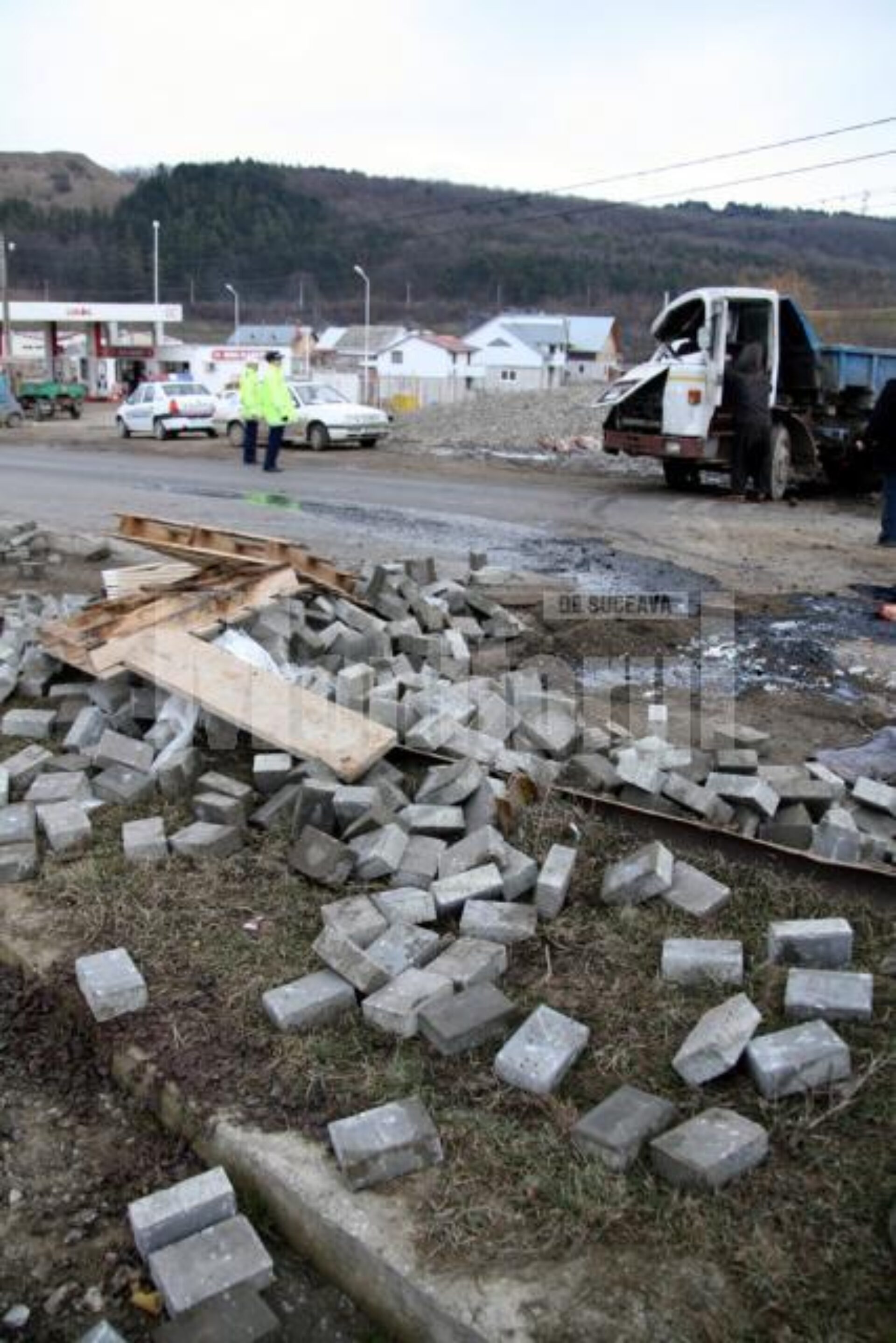 Constantin Morariu, în vârstă de 35 de ani, domiciliat în comuna Moara, șoferul basculantei răsturnate, le-a declarat polițiștilor că la intrarea în curba la stânga, înspre Șcheia, a evitat un alt camion care venea de pe sensul opus, și, pentru că nu se încadrase corespunzător, a ieșit pe acostamentul drumului. Din cauza diferenței de nivel, basculanta marca MAN, cu numărul de înmatriculare SV-05-SZB, a intrat în balans și s-a răsturnat, toată încărcătura ajungând la marginea drumului. Cu ajutorul mai multor oameni și al unui alt vehicul greu, basculanta a fost repusă pe patru roți și apoi trasă în afara drumului.