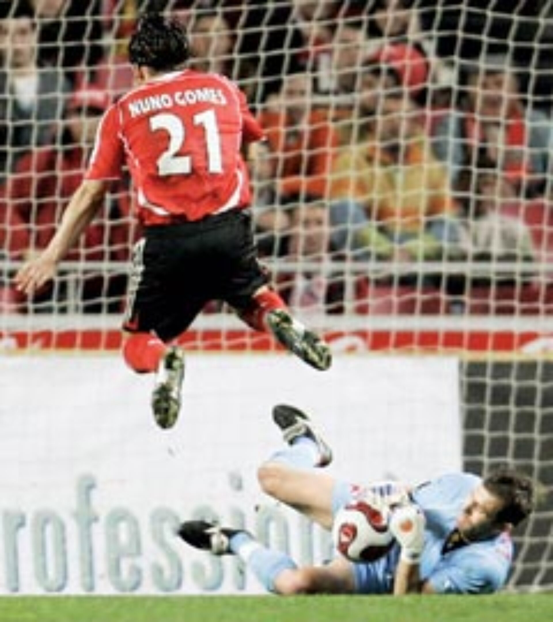 Echipa Dinamo București a fost învinsă, miercuri, în deplasare, cu scorul de 1-0 (0-0), de formația Benfica Lisabona, într-un meci din cadrul primei manșe a 16-imilor Cupei UEFA. În minutul 68, Moți a primit cartonașul galben, după ce jucătorii formației portugheze au cerut cartonașul roșu. Simao a executat lovitura liberă dictată de arbitru și a trimis mingea în bara transversală a porții apărate de Bogdan Lobonț. Miccoli a preluat mingea și a împins-o spre poartă, însă Blay a respins. Echipa Benfica a deschis scorul în minutul 89, prin Fabrizio Miccoli, care a trimis mingea în poartă, după ce portarul Lobonț a respins un șut trimis spre poartă de Simao. Pulhac (Dinamo) a ieșit accidentat, după ce și la antrenamentul de marți a terminat mai devreme pregătirea, acuzând dureri. Suporterii echipei Benfica au afișat un banner cu mesajul „Benfica Grande Amor”, pe care erau desenate mai multe inimioare. e partea cealaltă, fanii formației Dinamo au afișat un banner cu mesajul: „Georgescu după Raciti”. La meciul disputat pe stadionul Da Luz, cu o capacitate de 65.000 de locuri, au asistat aproximativ 30-35.000 de spectatori. Returul dintre Dinamo și Benfica va avea loc pe 22 februarie, la București.