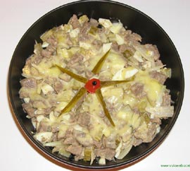 Se taie și carnea tot cuburi, se amestecă cu celelalte ingrediente, se adaugă porumbul din conservă și se omogenizează cu sosul de coctail.
