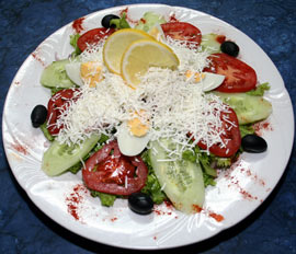 Se formează pe farfurie un pat format din salată verde și ceapă (paz) peste care se pune zeamă de lămâie, sare, ulei de măsline. Peste acest pat se așează în ordine castraveții (rondele), roșii (rondele), șuncă (baghete) maioneză, ouă (bărcuțe), peste care se rade brânză telemea. Se ornamentează cu măsline și lămâie.