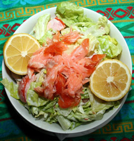 Se toacă legumele pe rând, se introduc într-un bol și se adaugă dresing-ul care este format din moscarpone (0,04 kg), ou (1 buc.), ulei măsline (0,02 kg), smântână dulce, apoi se ornamentează cu somon afumat și jumătăți de la lămâi.