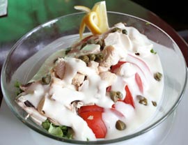 Se spală toate legumele, se toacă mărunt iar pieptul de pui se prăjește în puțin ulei cu condimente apoi se așează toate în bol. Se ornează cu maioneză, capere și lămâie.
