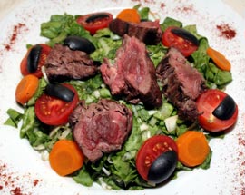 Mușchiul se porționează și se pune pe grătar. Salata verde și rucola se spală, se rupe și se amestecă cu prazul tăiat, se dă gust cu zeamă de lămâie. Se așează pe parfurie amestecul de salată iar peste mușchiul de vită, roșiile cherry, măslinele, morcovul.