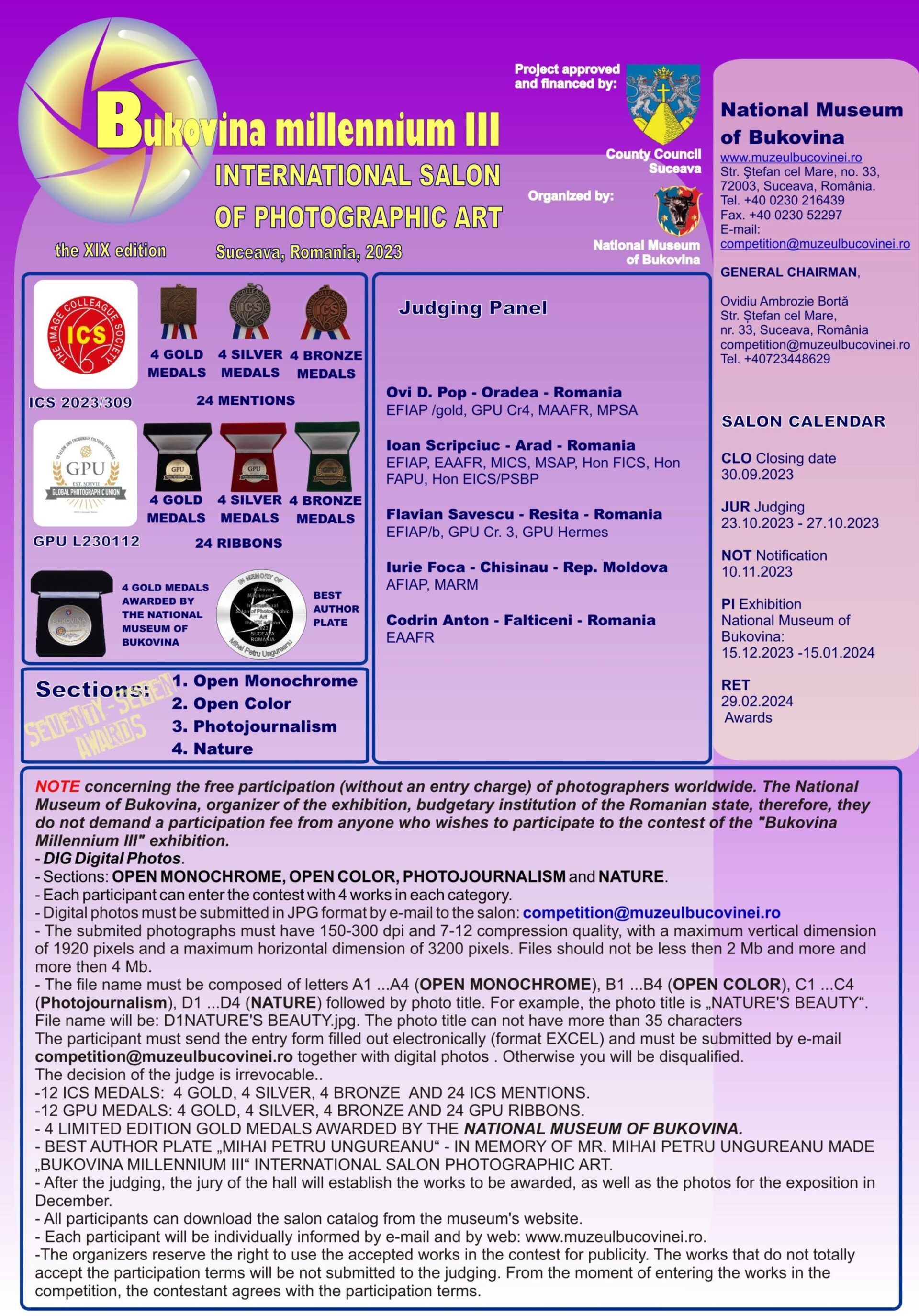 Muzeul Național al Bucovinei organizează Salonul Internațional de Artă Fotografică „Bucovina Mileniul III” – ediția a XIX-a, eveniment ce se desfășoară sub înaltele patronaje ICS (Image Colleague Society) și GPU (Global Photographic Union).