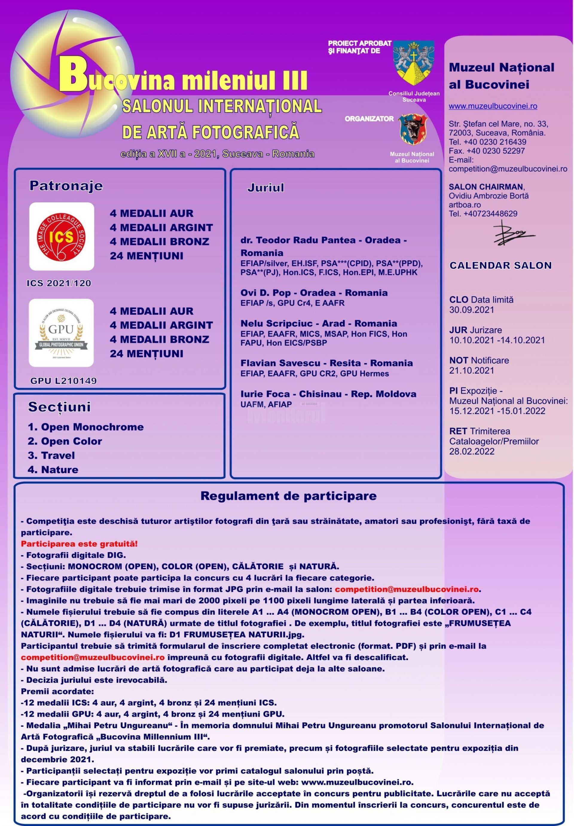 Muzeul Național al Bucovinei organizează anul acesta Salonul Internațional de Artă Fotografică „Bucovina Mileniul III”, eveniment ajuns la ediția a XVII-a. La salonul de artă fotografică se pot înscrie artiști fotografi amatori sau profesioniști din țară și din străinătate, fără taxă de participare. Evenimentul se desfășoară sub înaltele patronaje ICS (Image Colleague Society) și GPU (Global Photographic Union).