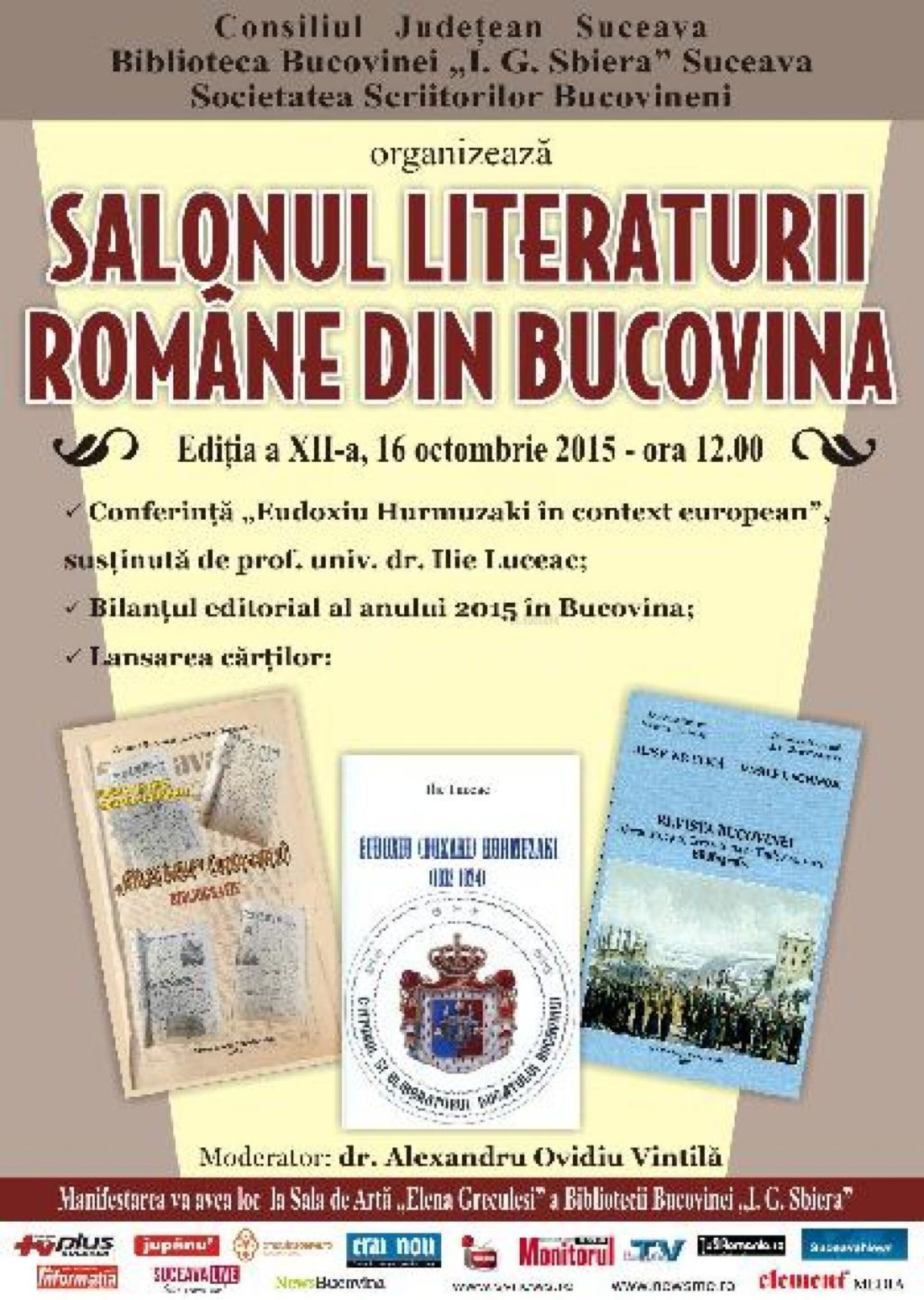 Consiliul Județean (CJ) Suceava, Biblioteca Bucovinei „I.G. Sbiera” și Societatea Scriitorilor Bucovineni (SSB) organizează vineri, 16 octombrie a.c., începând cu ora 12.00, în Sala de Artă „Elena Greculesi” a bibliotecii publice sucevene, cea de-a XII-a ediție a Salonului Literaturii Române din Bucovina.Evenimentul va cuprinde conferința cu tema „Eudoxiu Hurmuzaki în context contemporan”, susținută de prof. univ. dr. Ilie Luceac, prezentarea „Bilanțului editorial al anului 2015 în Bucovina” și lansarea unor cărți care vizează spațiul bucovinean.Moderator: dr. Alexandru Ovidiu Vintilă, redactorul-șef al revistei „Bucovina literară”, publicație a SSB, care apare cu sprijinul CJ Suceava sub egida Bibliotecii Bucovinei „I.G. Sbiera”.