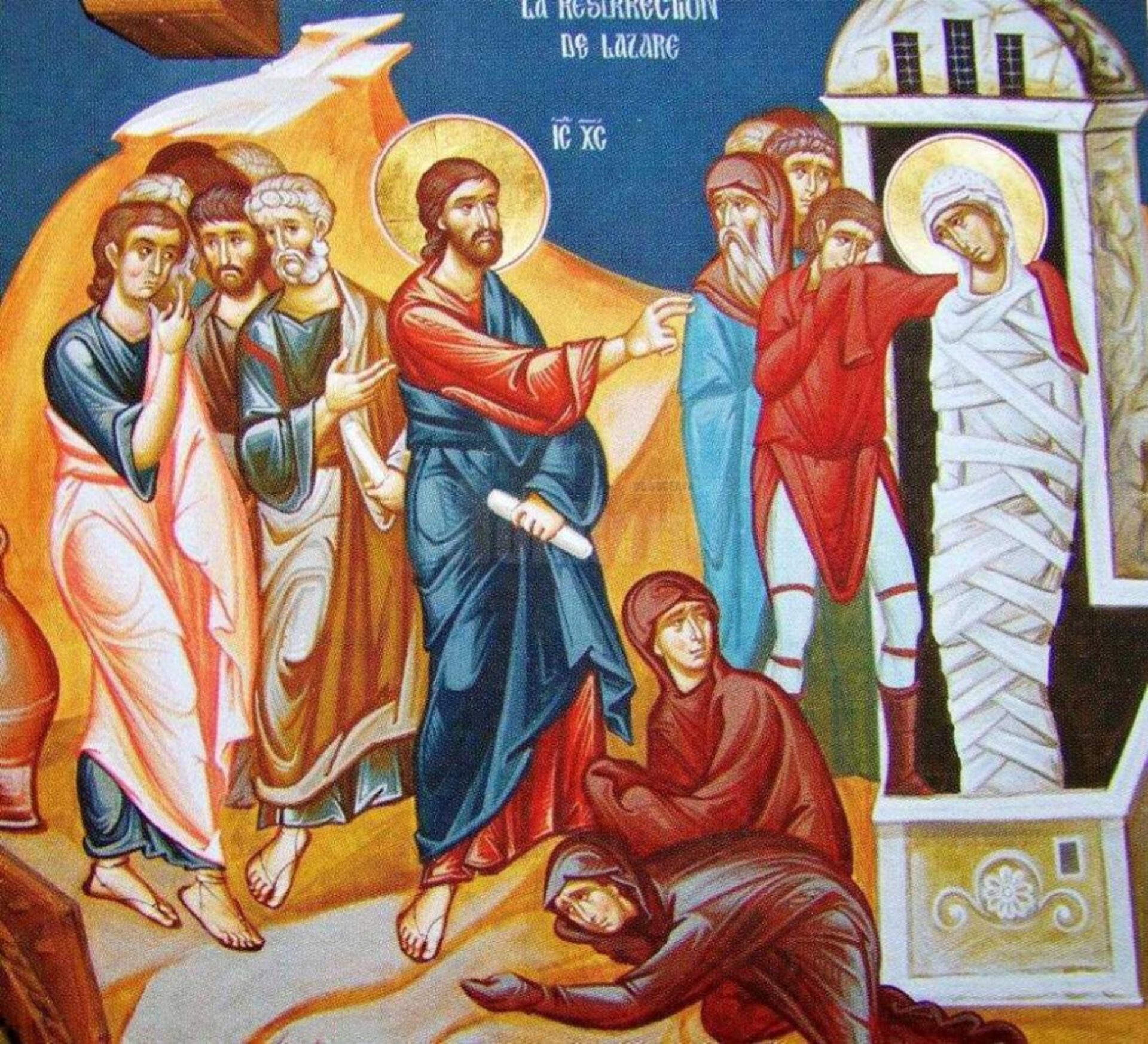 O întâlnește apoi pe cealaltă soră, Maria, venită și ea în grabă, întrucât auzise că Învățătorul a sosit în satul lor. Văzând durerea celor două surori și a prietenilor acestora, Iisus S-a întristat și El, și, în fața mormântului lui Lazăr a plâns. Hristos, Viața și dătătorul vieții, se afla față în față cu moartea. Cel care crease omul pentru o viață veșnică vedea înaintea sa cum acesta este cuprins de putreziciune și descompunere. Cere atunci să fie dată la o parte piatra de la ușa mormântului. Marta încearcă să se împotrivească, spunând că deja miroase urât, adică Lazăr intrase în putrefacție. Hristos, îndemnând-o să aibă credință, mulțumește mai întâi Tatălui pentru minunea ce avea să se întâmple, apoi îl cheamă pe Lazăr afară. Acesta iese din mormânt așa cum fusese îngropat: înfășurat în giulgiu și cu mahrama pe față. Bucurie, uimire, cutremurare… Văzând minunea, unii dintre cei prezenți au crezut în Hristos, alții însă, amintind de frații bogatului nemilostiv, pentru care acesta cerea să le fie trimis săracul Lazăr înviat pentru a crede, au găsit cu cale să meargă și să-L pârască la farisei. Acum, sinedriul se întrunește și hotărăște uciderea lui Iisus, dar și a lui Lazăr cel înviat.