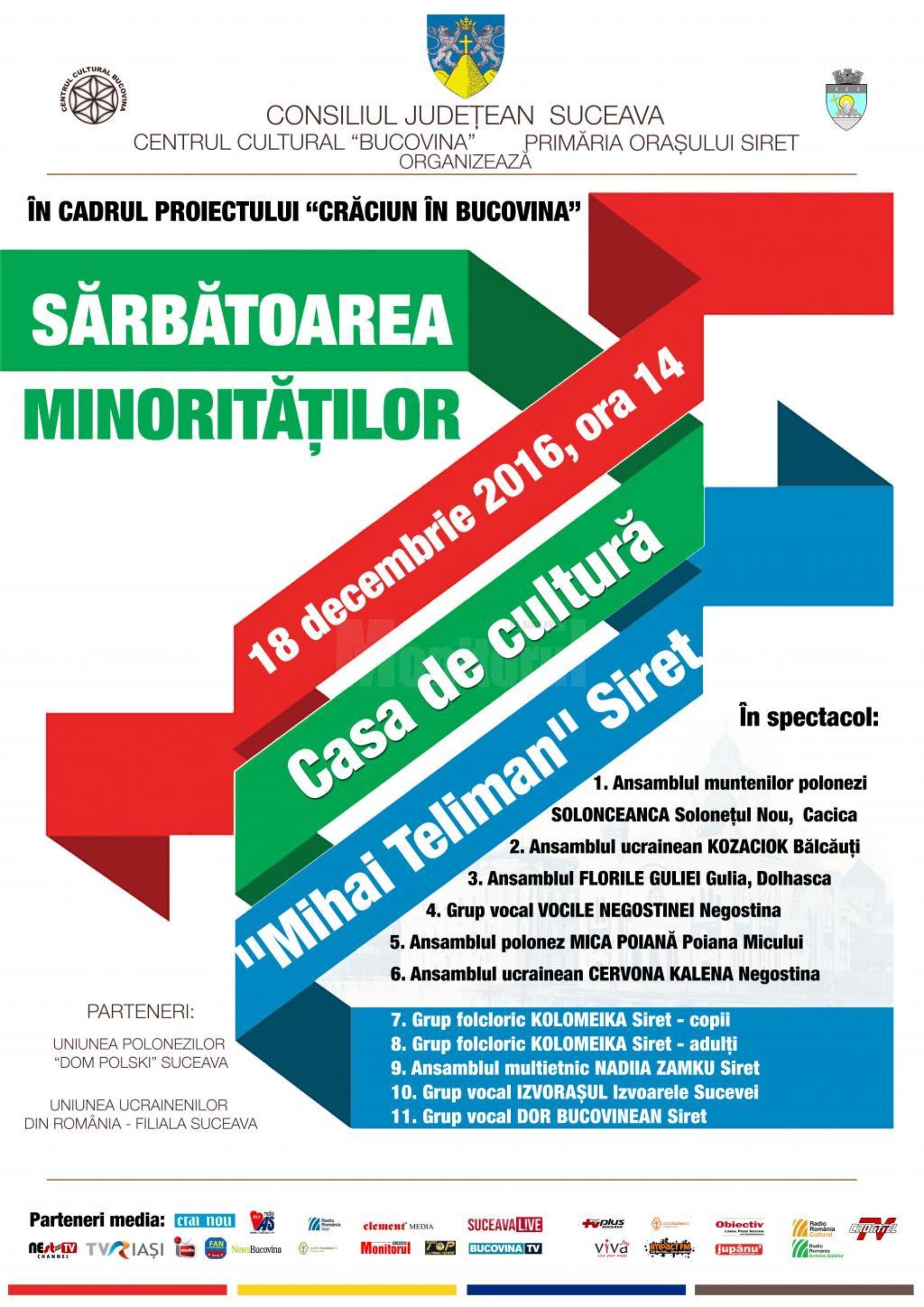 Consiliul Județean Suceava, Centrul Cultural „Bucovina” și Primăria orașului Siret, având ca parteneri Uniunea Polonezilor din România „Dom Polski” și Uniunea Ucrainenilor din România – Filiala Suceava, organizează duminică, 18 decembrie a.c., începând cu ora 14.00, la Casa de Cultură / Centrul Cultural „Mihai Teliman” Siret, „Sărbătoarea Minorităților”.