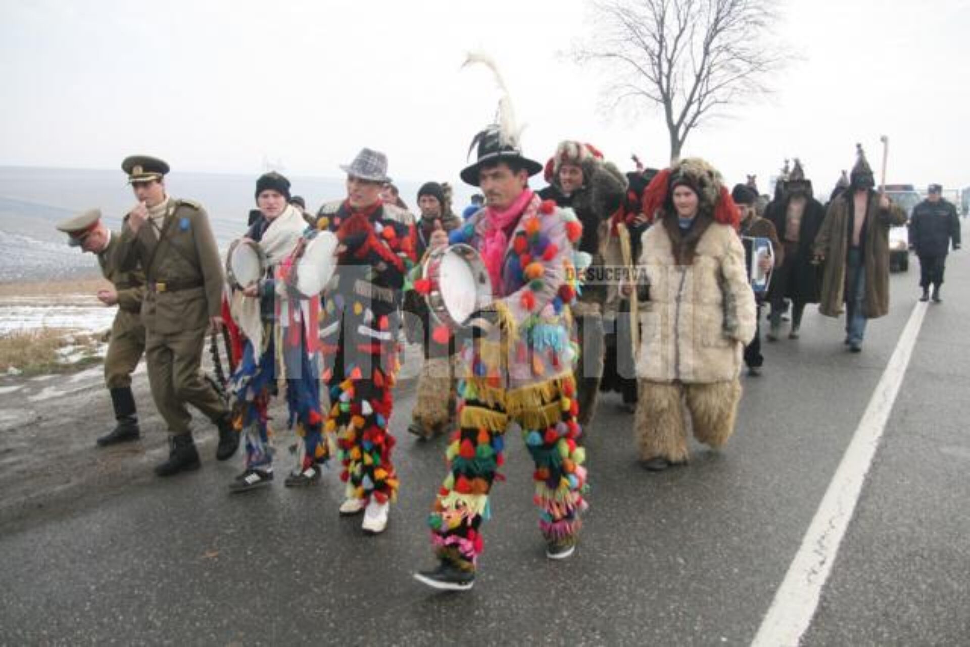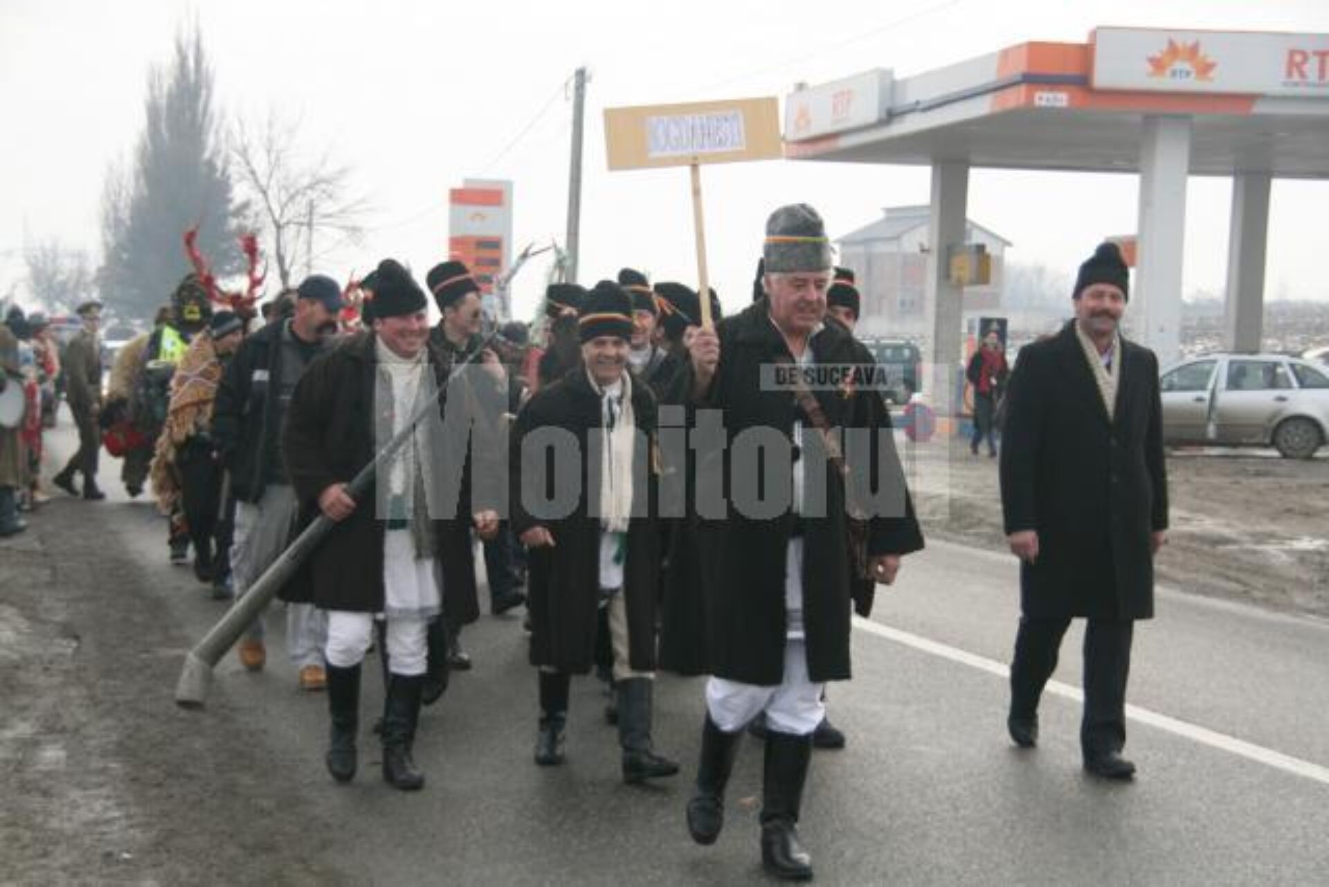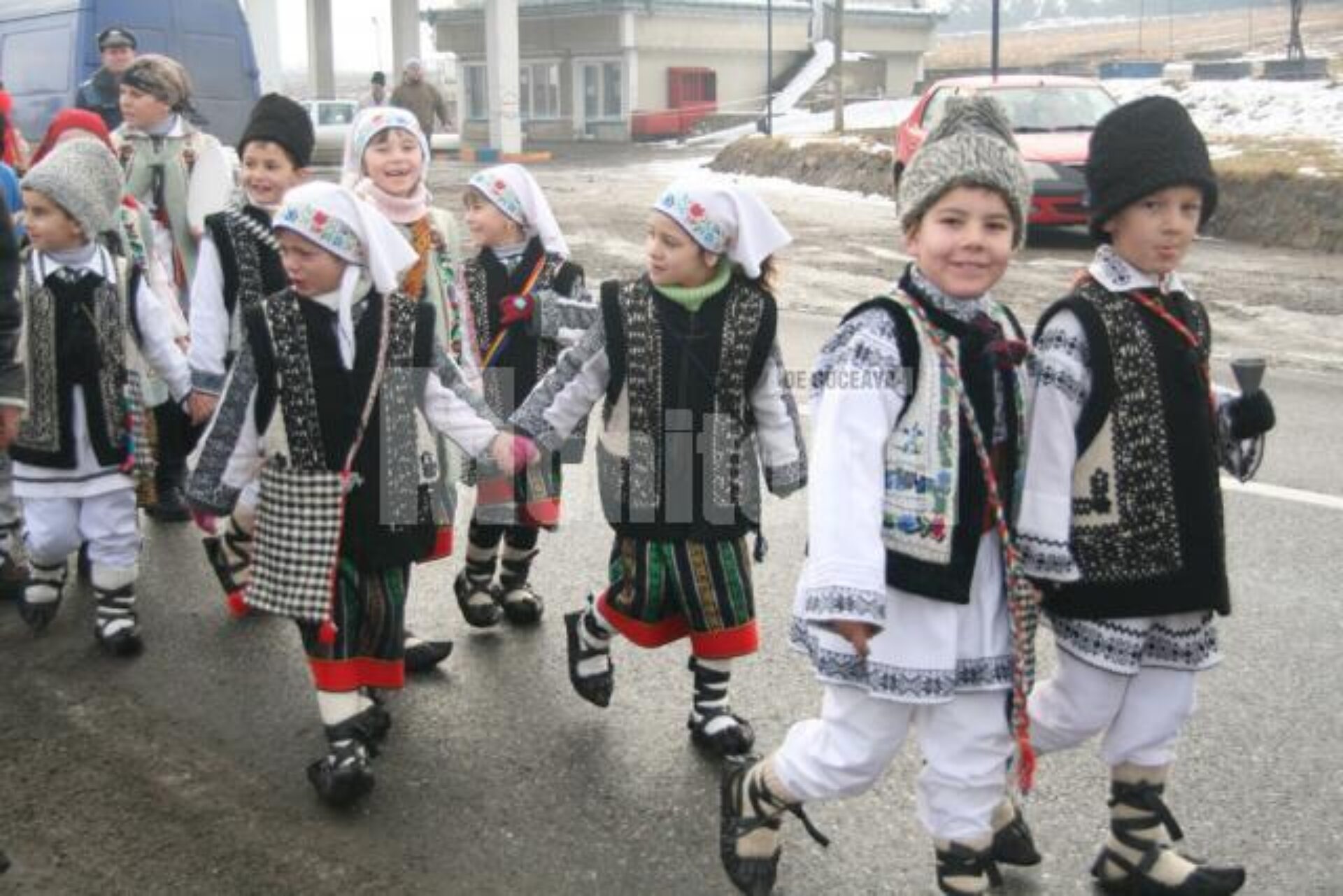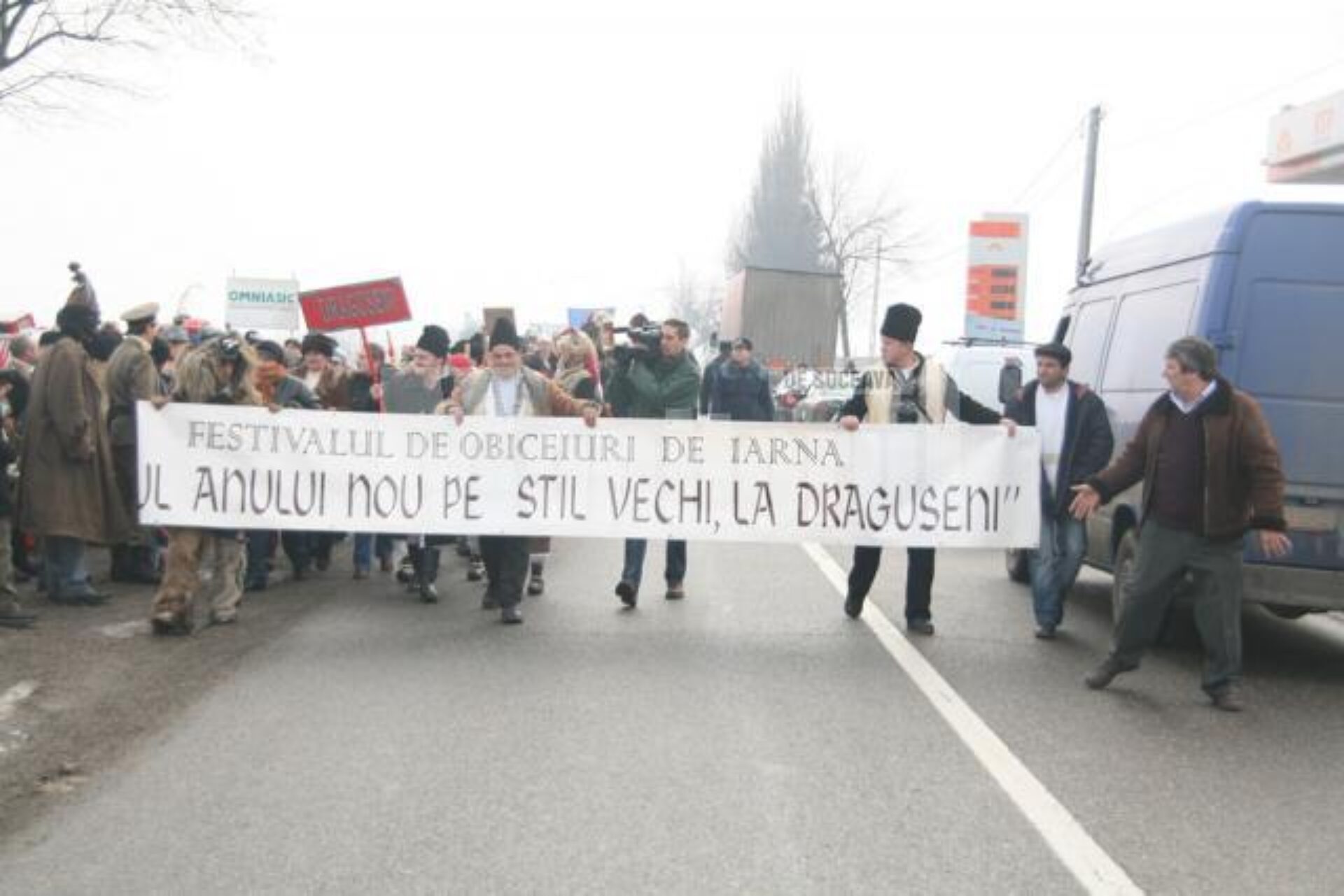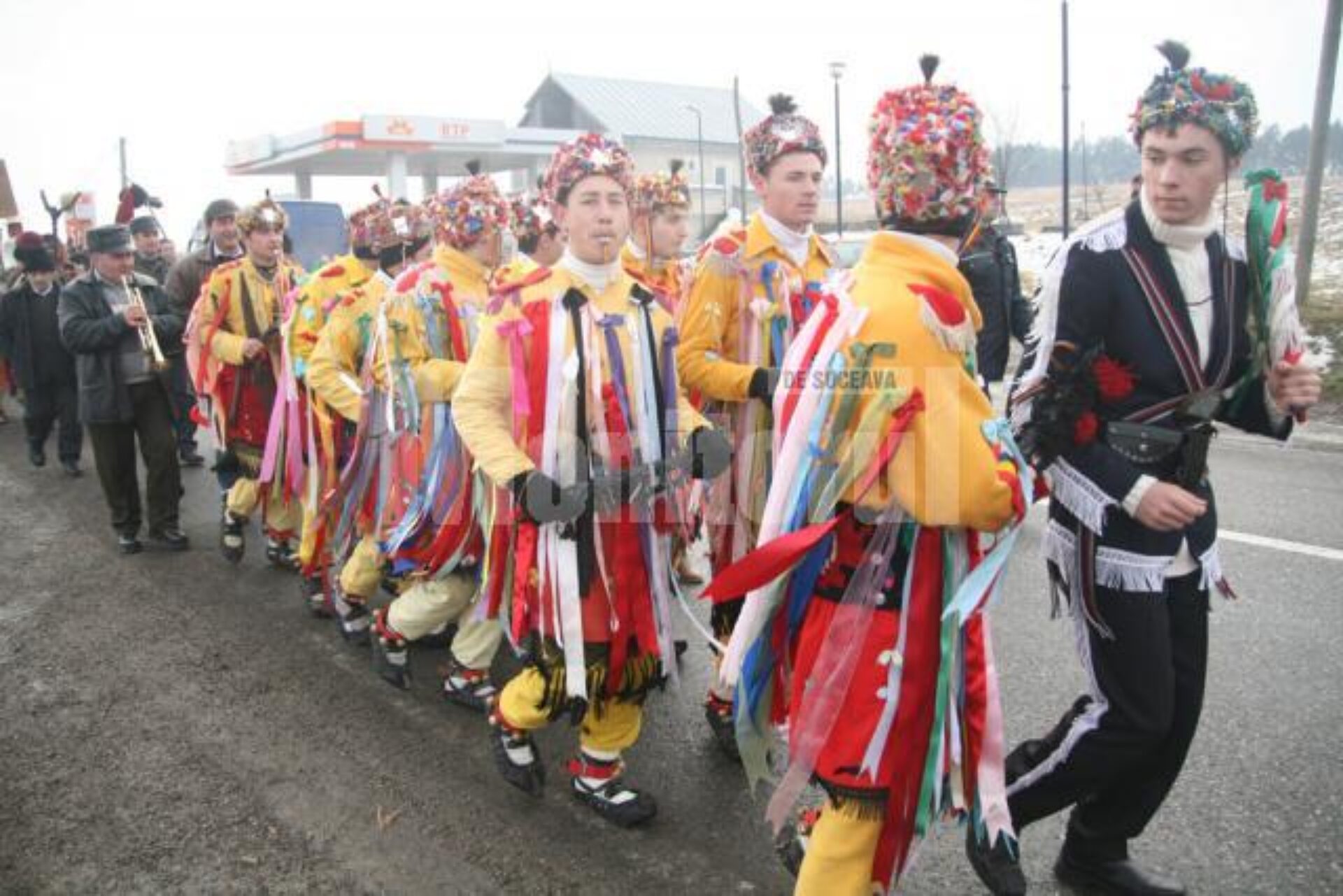 Peste 300 de mascați și dansatori de toate vârstele din comunele sucevene Boroaia, Bogdănești, Râșca, Drăgușeni, Dolheștii Mici și Forăști, în care trăiesc ortodocși de stil vechi, împreună cu alți circa 80 din localitățile ieșene Miroslăvești și Pașcani au făcut deliciul șoferilor care s-au aflat ieri la amiază pe traseu și care au răspuns cu claxoane și fluturări de mâini la urăturile tradiționale.