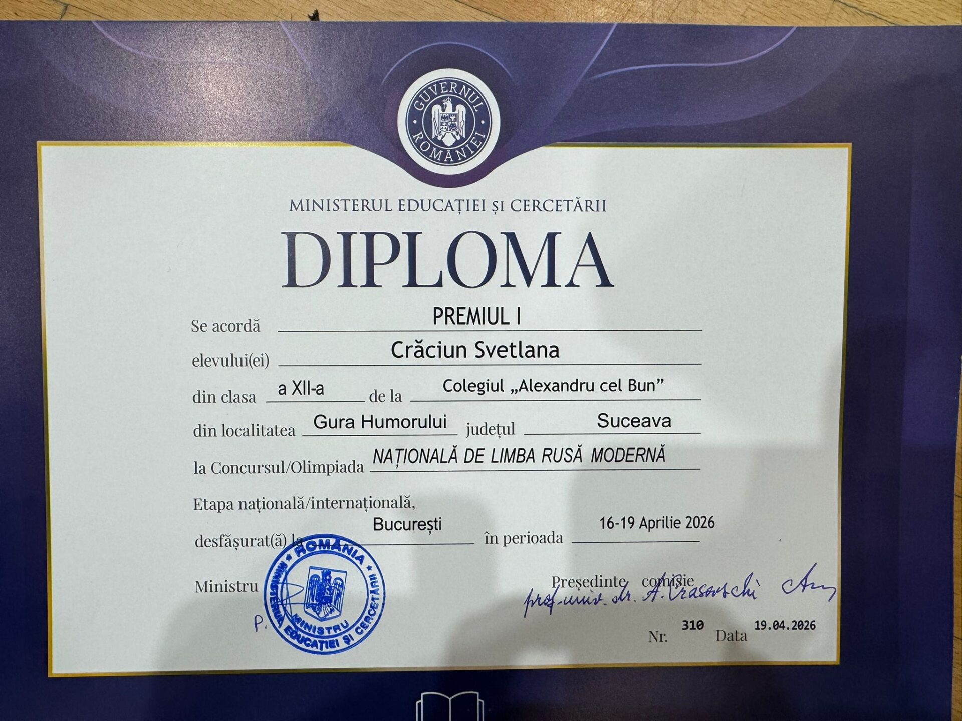 - Premiul I – Burdeinîi Danila, clasa a IX-a, Colegiul „Alexandru cel Bun” Gura Humorului