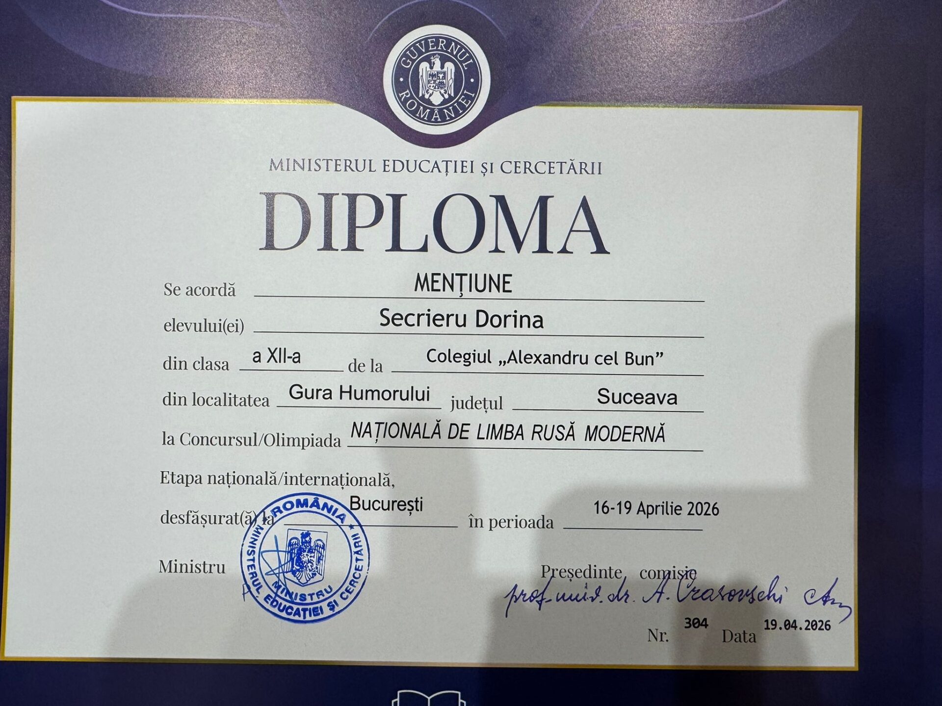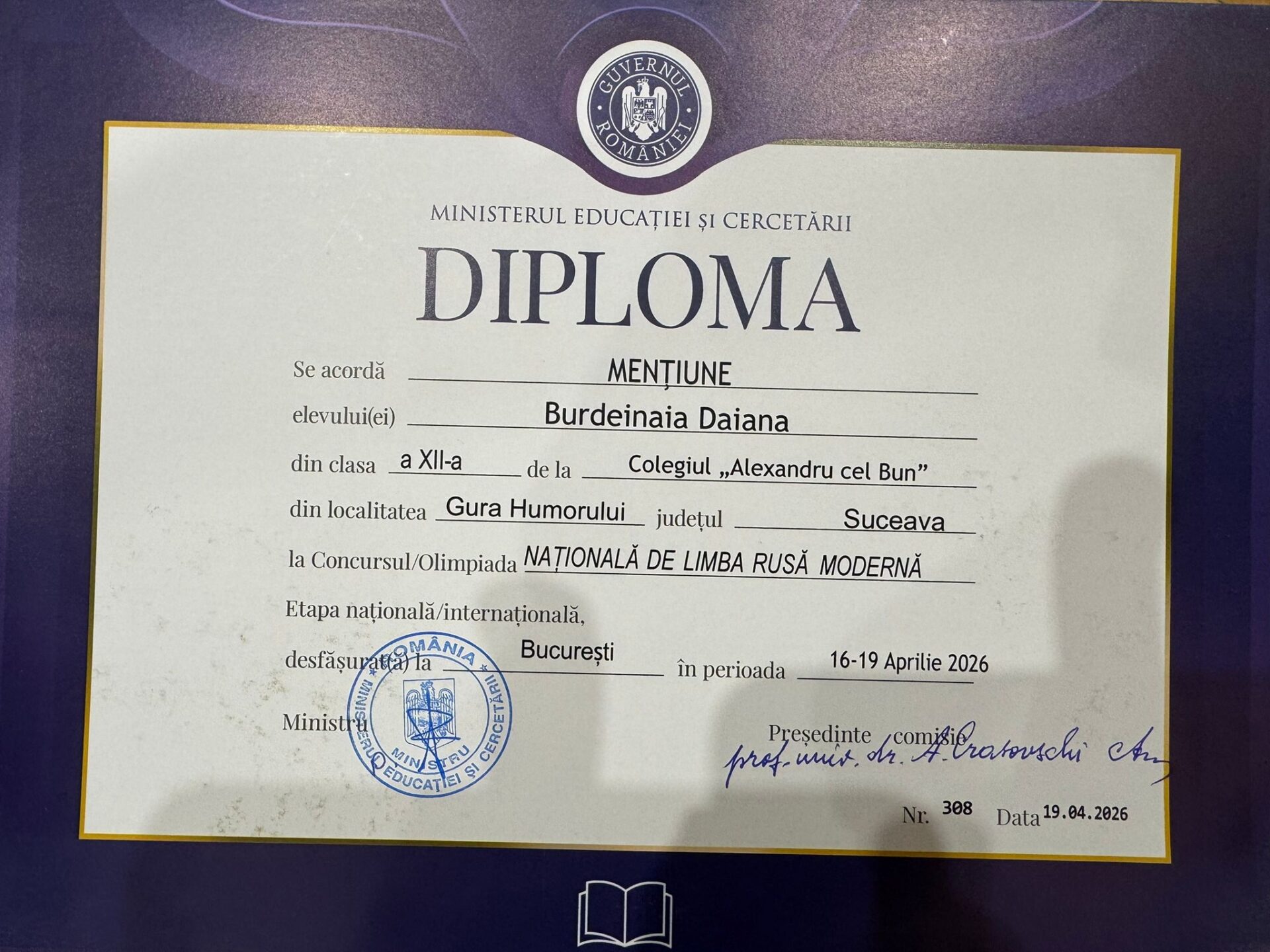 - Mențiune – Burdeinaia Daiana, clasa a XII-a, Colegiul „Alexandru cel Bun” Gura Humorului