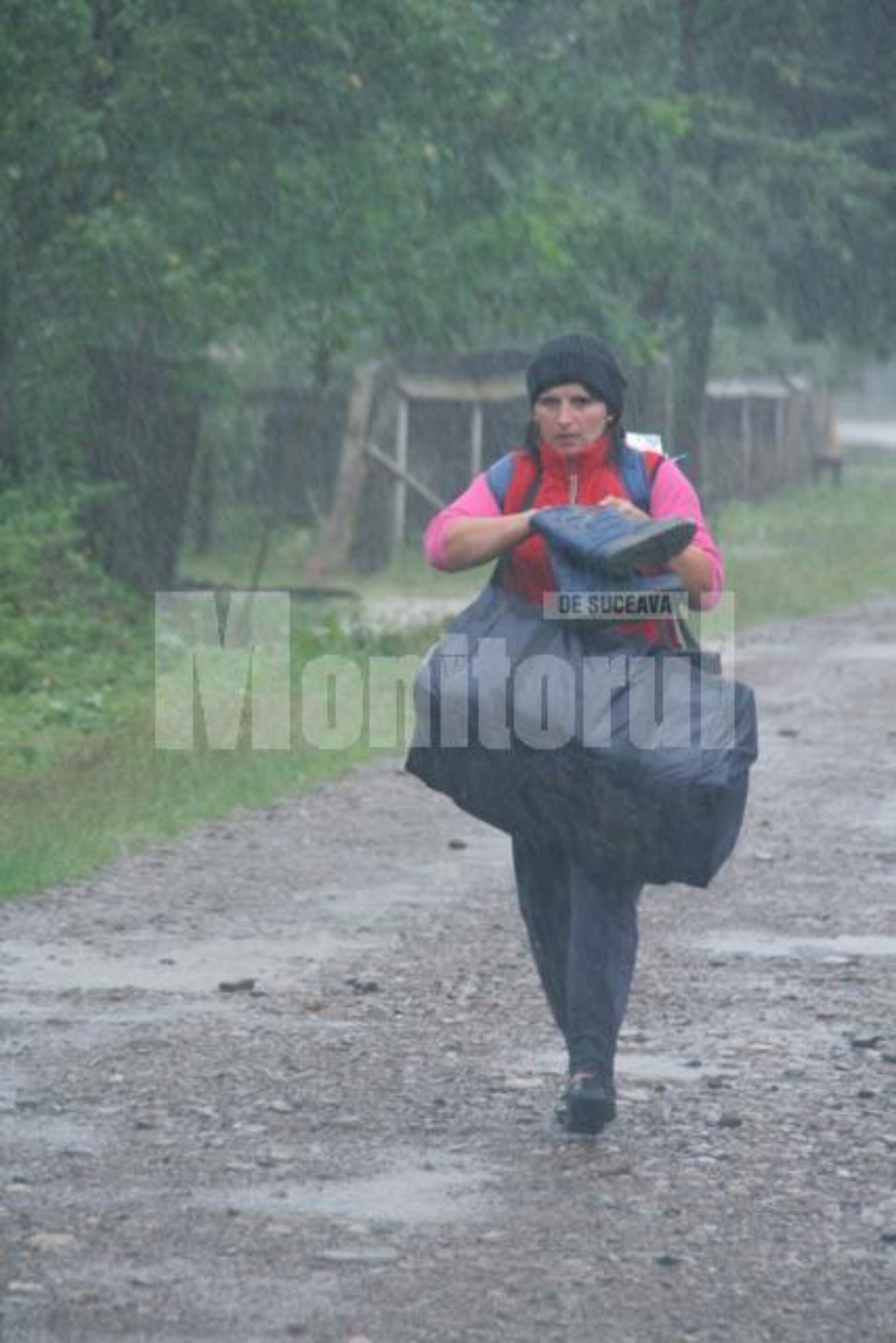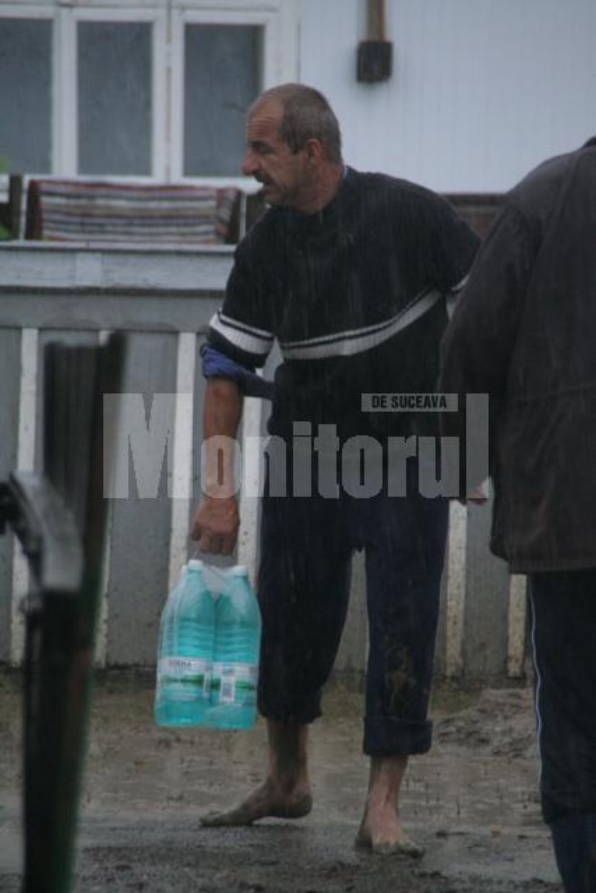 Microbuzul cu apă și pâine a oprit în dreptul casei familiei Onisemiuc. Rodica Onisemiuc (46 de ani) apucă pâinile în brațe, le ascunde sub pelerina de ploaie și se duce repede să le pună într-un loc în care apa nu a ajuns încă, urmată fiind de soțul ei, care a luat baxul de apă.