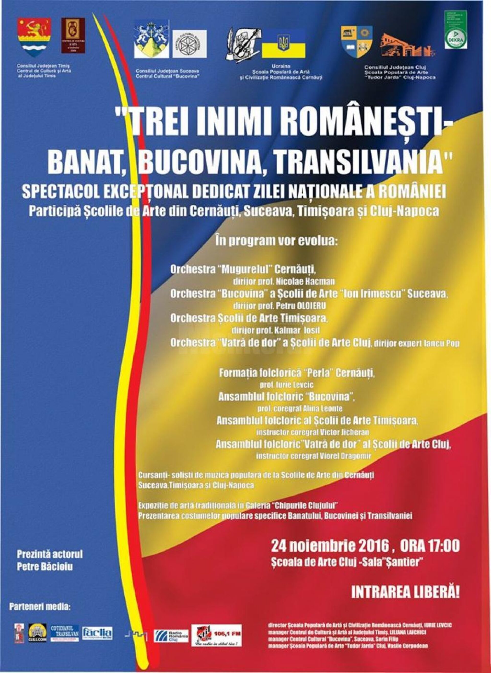 Centrul Cultural „Bucovina” – Școala de Arte „Ion Irimescu” Suceava participă la realizarea spectacolului excepțional cu genericul „Trei inimi românești – Banat, Bucovina, Transilvania”, dedicat Zilei Naționale a României, care va avea loc joi, 24 noiembrie a.c., la ora 17.00, în Sala „Șantier” a Școlii Populare de Arte „Tudor Jardă” din Cluj-Napoca.