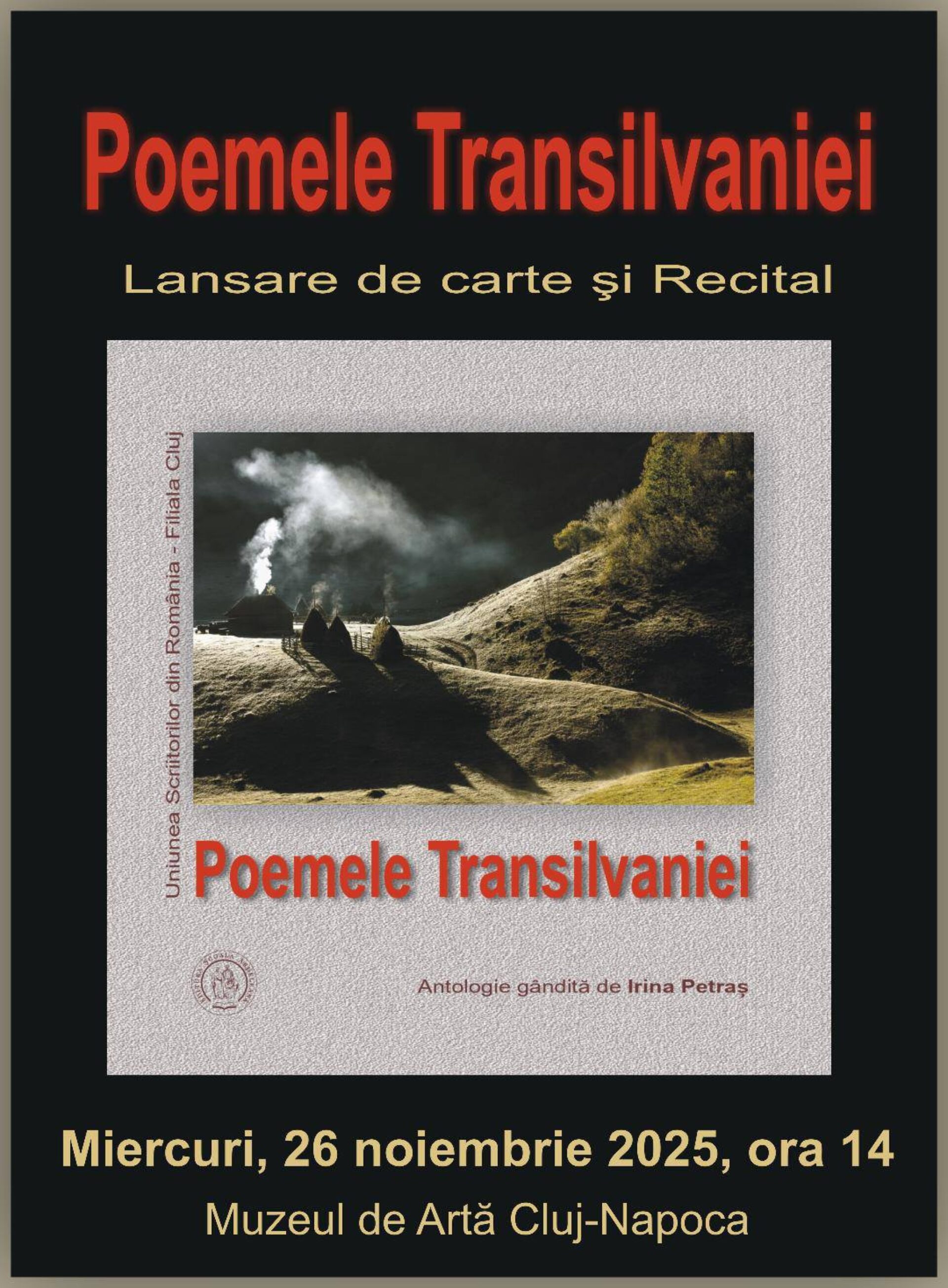 „Magia tradițională de culoare și de poezie, unică în Cluj și în România, a fost însoțită de vernisarea expoziției de pictură – eseuri în ulei, aparținând tot autoarei Irina Petraș, intitulată <De-a culorile>. Antologia <Poemele Transilvaniei> va fi lansată și la standul Editurii Școala Ardeleană, deschisă la Târgul Internațional de Carte de la București, Gaudeamus, care are loc în această săptămână, între 3 și 7 decembrie, la Pavilionul B2 Romexpo”, a transmis Angela Furtună.