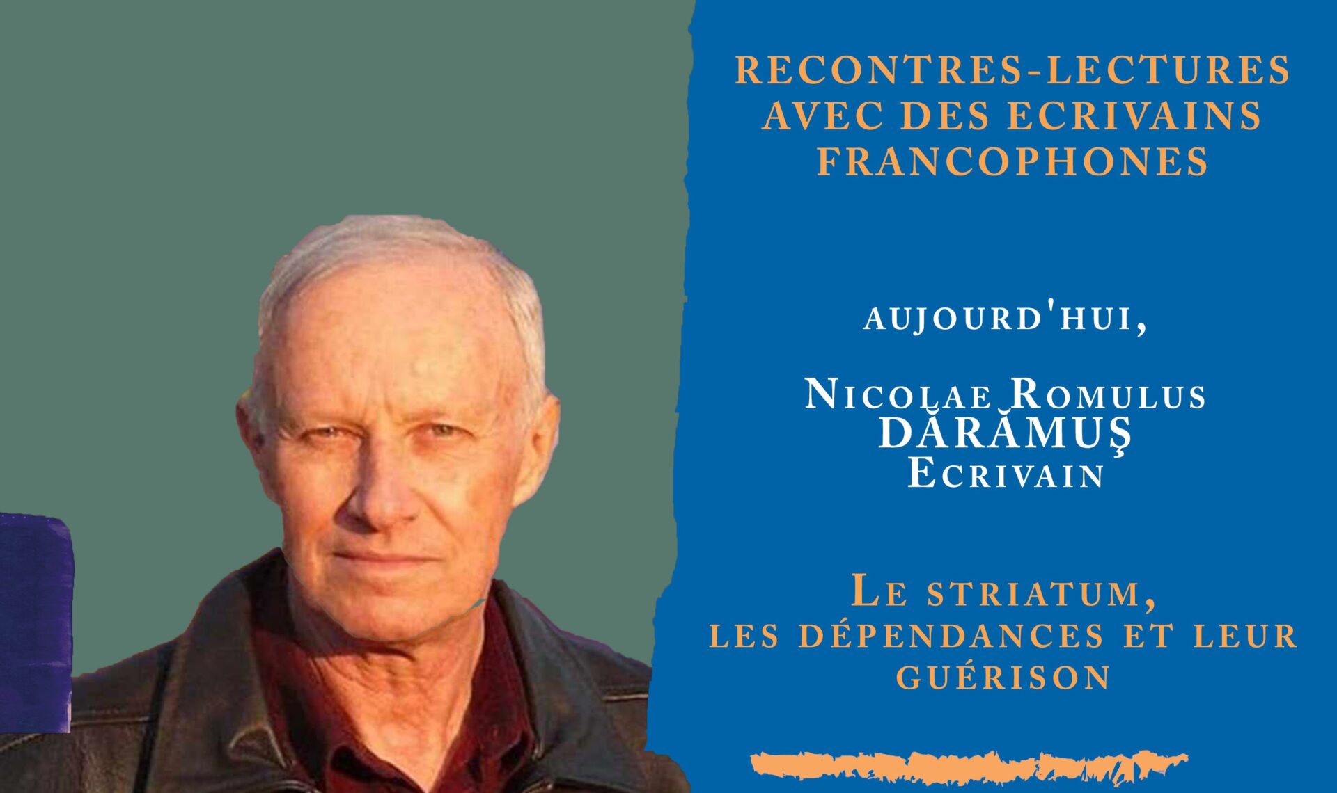 Întâlnirea din această săptămână cu scriitorul Nicolae Romulus Dărămuş propune publicului francofilofon al Alianței Franceze din Suceava o dezbatere pe tema „Striatumul, dependenţele şi vindecarea lor”.