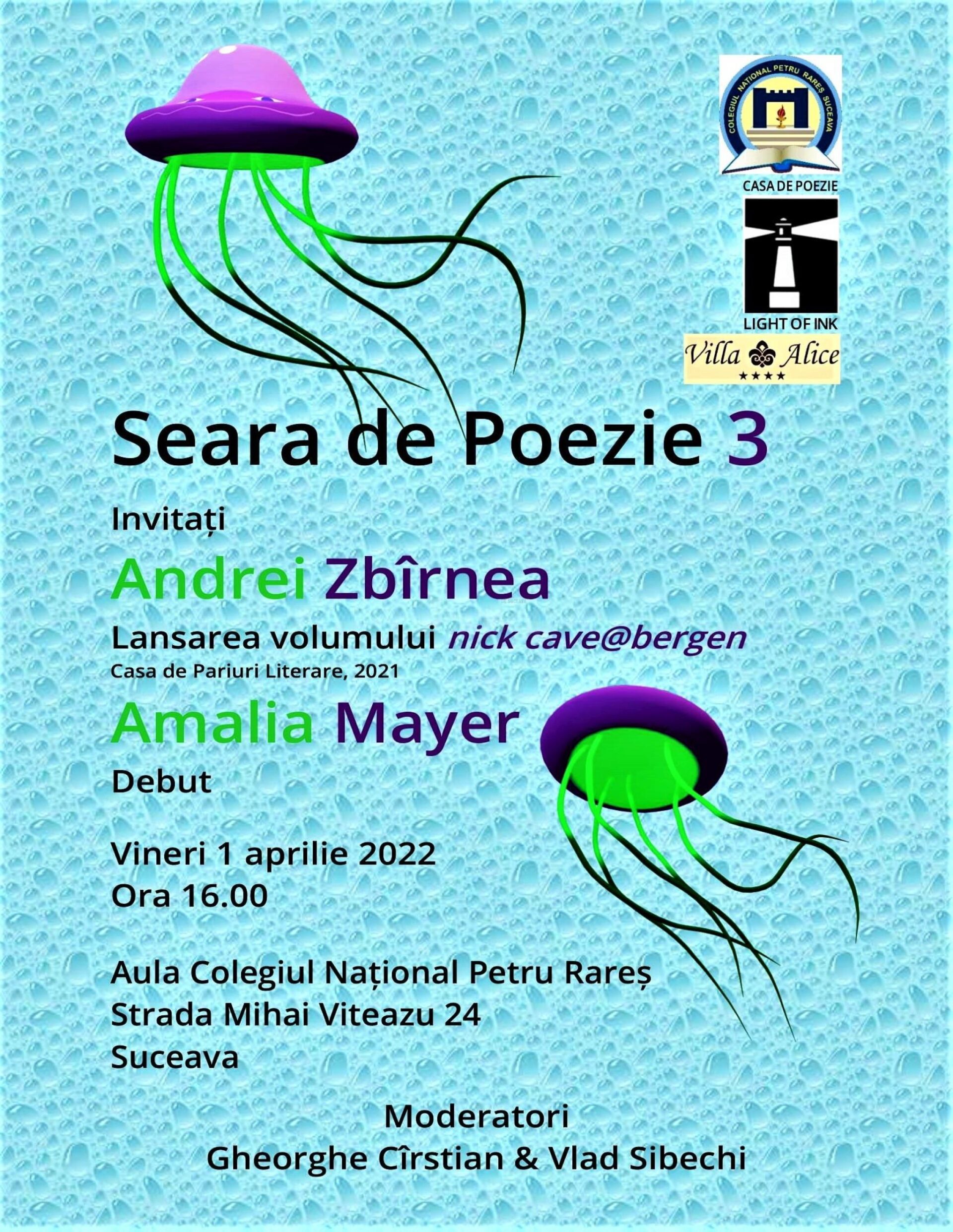 Casa de Poezie Light of ink, Colegiul Național „Petru Rareș” Suceava și Villa Alice organizează o nouă „Seară de Poezie” la care sunt invitați poetul Andrei Zbîrnea și poeta Amalia Mayer.