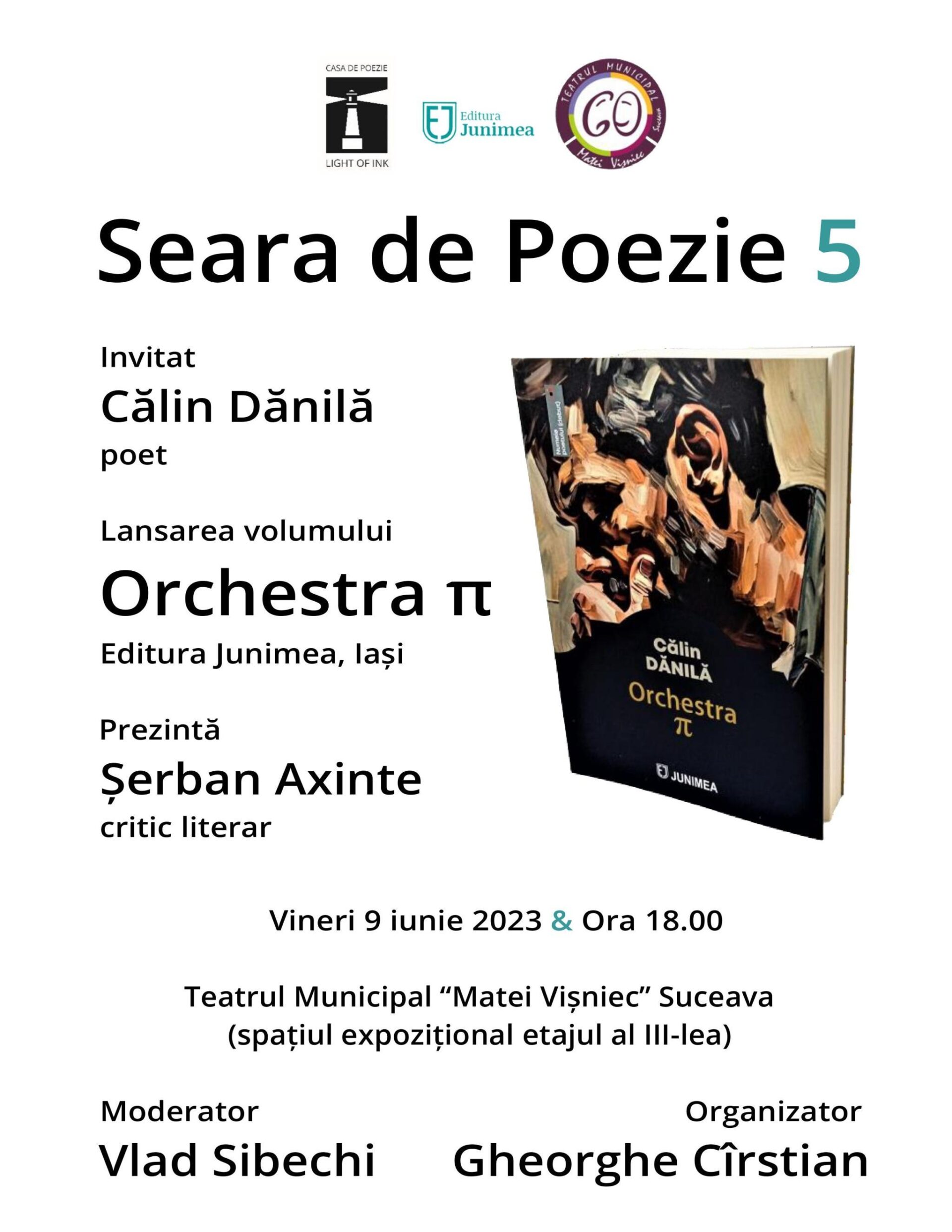 Invitatul Serii de Poezie este poetul Călin Dănilă. Seara de Poezie este dedicată lansării volumului „Orchestra π”, apărut în colecția „Numele poetului (debut)” la Editura Junimea, Iași. Volumul va fi prezentat de criticul literar Șerban Axinte. Moderatorul acțiunii este poetul Vlad Sibechi.