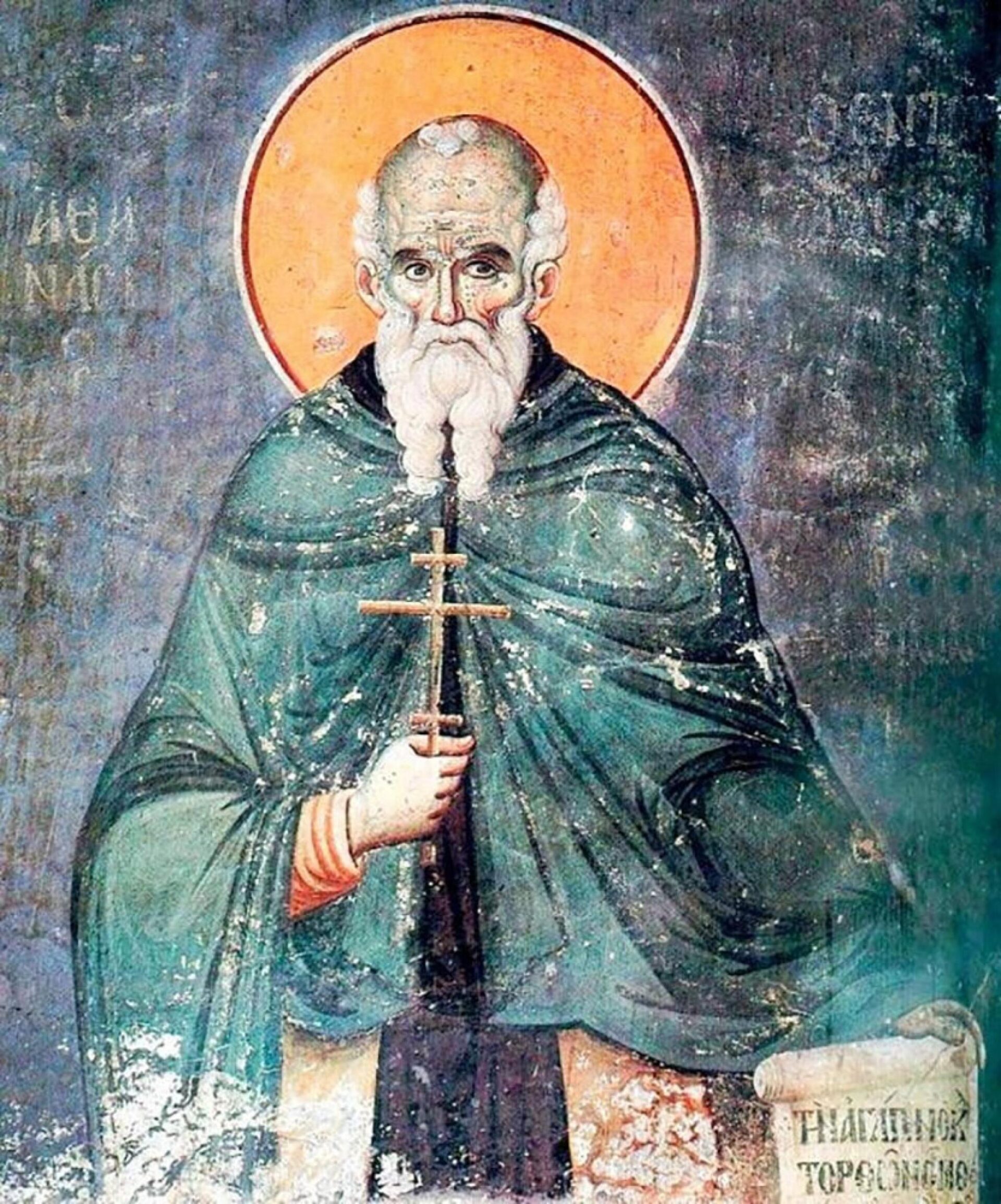 Sfântul Cuvios Atanasie s-a născut pe la anul 930 în Trapezunt, primind la Botez numele de Avramie. Părinții săi erau de neam bun și evlavioși. Rămas orfan de ambii părinți, a fost crescut de o rudă cucernică a mamei sale. Deși era tânăr, a părăsit cetatea sa și s-a dus la Mănăstirea Chiminas din Asia. Aici, egumenul Mihail l-a primit pe Sfântul Atanasie în rândul monahilor, dându-i ascultarea de a copia cărți pentru trebuința oamenilor. Pentru smerenia și devotamentul cu care împlinea toate hotărârile mai-marilor mănăstirii a fost numit „fiul ascultării”. Din râvna ce avea pentru osteneli mai grele a plecat pe Muntele Athos, unde s-a hotărât să ridice o biserică. Pentru aceasta s-a dus la împăratul Nichifor Focas (963-969), cu care fusese prieten în vremea când împreună se aflau la învățătură la Constantinopol, și cu ajutorul său a zidit în locul arătat o preafrumoasă biserică, pe care a închinat-o Maicii Domnului. A zidit apoi și o lavră, pentru mai mulți nevoitori. Și se silea sfântul să refacă bolta bisericii și la o mai bună înfățișare să o aducă. Deci, suindu-se pe schelă împreună cu alți șase frați, s-a surpat bolta cu ei. Și așa s-a săvârșit Sfântul Atanasie, dându-și sufletul în mâinile Domnului.