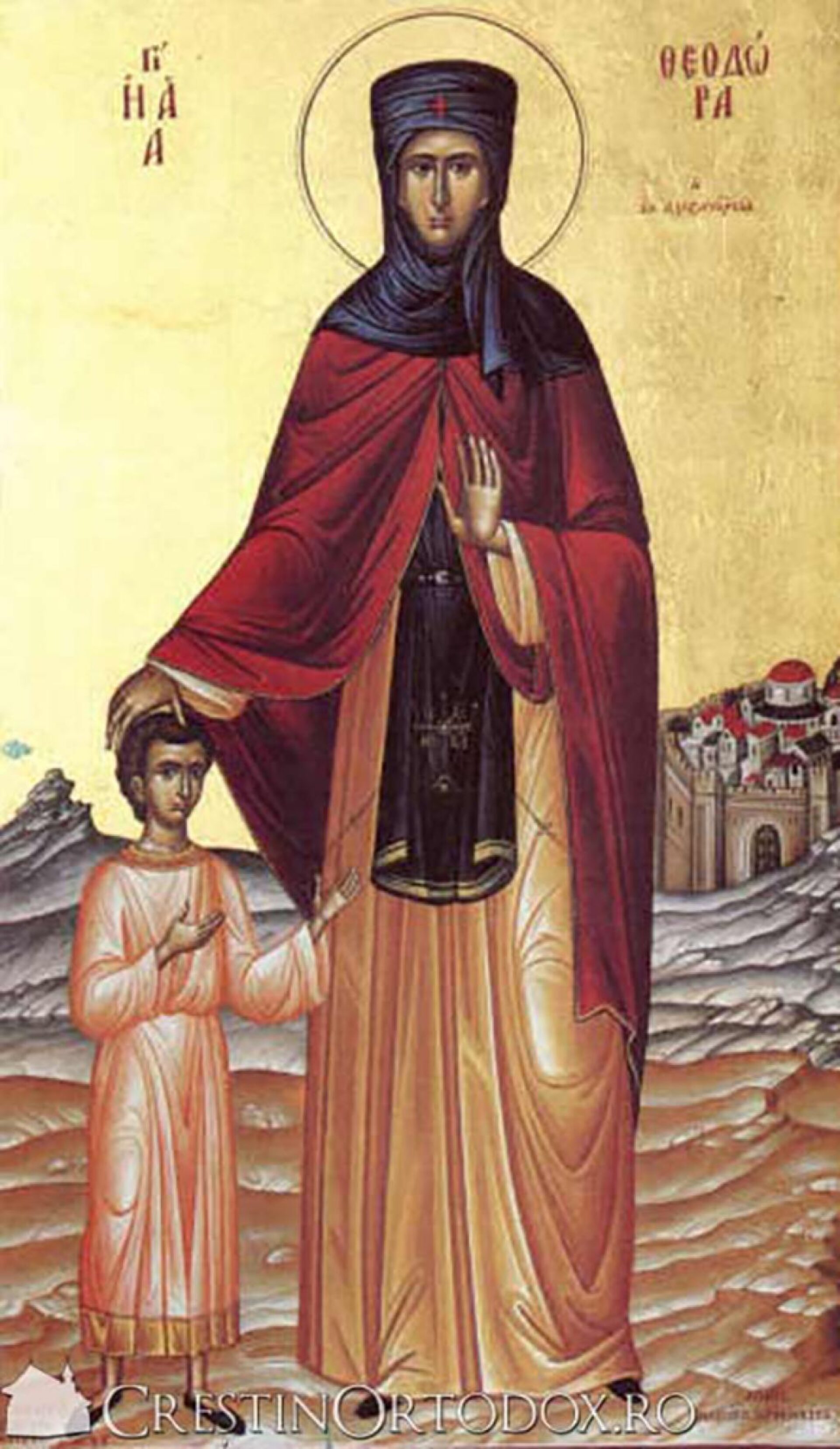 Sfânta Teodora era din Alexandria Egiptului. În timpul împăratului Zenon din Constantinopol (474-491), părinții ei, bogați, au măritat-o de tânără cu un om de seamă ducând o viață fericită. Pentru că era tânără și frumoasă, s-a lăsat ademenită de stăruințele unui tânăr și a căzut în desfrânare. După ce a săvârșit păcatul, s-a întristat, a început a se tângui cu amar și a intrat într-o mănăstire, unde s-a dat drept bărbat. După doi ani de pocăință au venit și ispitele, a fost acuzată că a lăsat însărcinată o femeie. Pentru că a primit învinuirea, familia femeii i-a adus copilul și Teodora l-a crescut timp de 7 ani, dar în afara mănăstirii, pentru că a fost alungată. Însă, milostivindu-se călugării, au reprimit-o pe cuvioasă în mănăstire. Nu după mult timp, au găsit-o pe Teodora răposată în chilie și pe copil adormit de la plâns. Așa au aflat călugării că este femeie, cerându-i iertare Sfintei Teodora. Soțul ei, aflând acestea, a venit la mănăstire și a trăit până la moartea sa în chilia sfintei, iar copilul a ajuns mai târziu egumen al mănăstirii. (Ziarul Lumina)