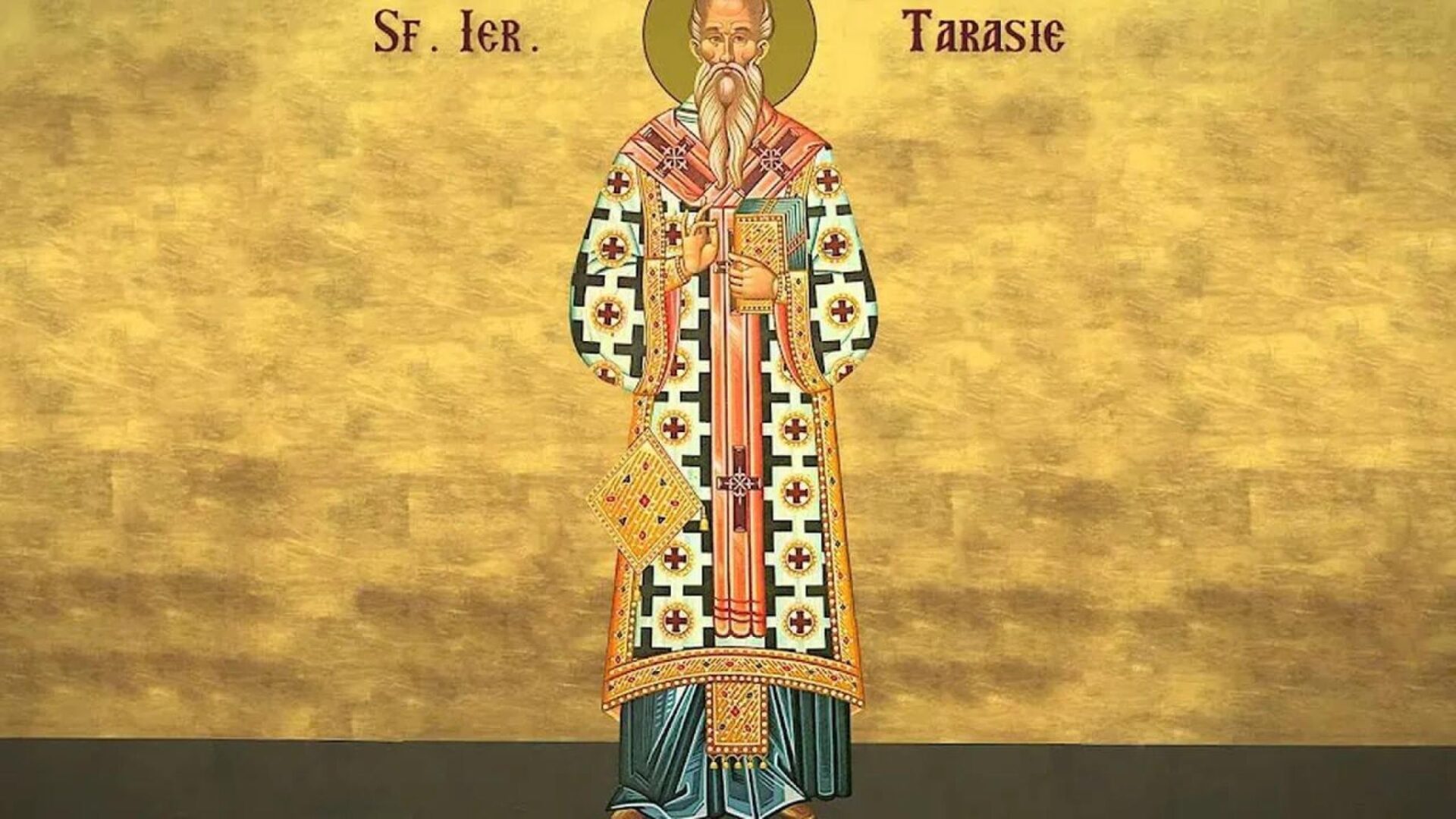 Sfântul Tarasie (†806) s-a născut la Constantinopol, iar părinții săi se numeau Gheorghe și Eucratia. Urmând pilda tatălui său, Tarasie a ajuns la dregătoria de sfetnic împărătesc. Cu toate că avea o funcție mare, Tarasie trăia în taină o viață de adâncă evlavie. În acea vreme, Biserica lui Hristos era tulburată de erezia iconoclastă. În 752 se ținuse la Constantinopol un sinod în cadrul căruia această erezie biruise. De aceea, mulți creștini nu îndrăzneau să mărturisească învățătura cea adevărată a Bisericii, moștenită de la Sfinții Apostoli, conform căreia cinstirea icoanelor este permisă. În urma acelui sinod, împărații au întemnițat pe mulți creștini care nu voiau să ardă sfintele icoane. În acele vremuri tulburi, ochii tuturor erau îndreptați spre Sfântul Tarasie pentru ca el să devină Patriarh al Constantinopolului. Însăși împărăteasa Irina (797-802) l-a îndemnat să accepte înalta slujire. Sfântul Tarasie a primit aceasta, dar cu un singur preț: împărăția Bizanțului să adune într-un sinod pe toată lumea, pe solii întregii creștinătăți, așa încât să se refacă unitatea de credință. Împărăteasa Irina a primit acest sfat, iar Sfântul Tarasie a fost sfințit Patriarh al Constantinopolului și a fost convocat astfel cel de-al 7-lea Sinod Ecumenic de la Niceea, în anul 787. La sinod, erezia iconoclastă a fost osândită, iar dreapta credință statornicită, și anume aceea că cinstirea icoanei nu merge la icoana însăși, ci la chipul înfățișat pe ea. Deci, cârmuind Biserica lui Hristos timp de 22 de ani, Sfântul Tarasie s-a mutat în pace la Domnul.