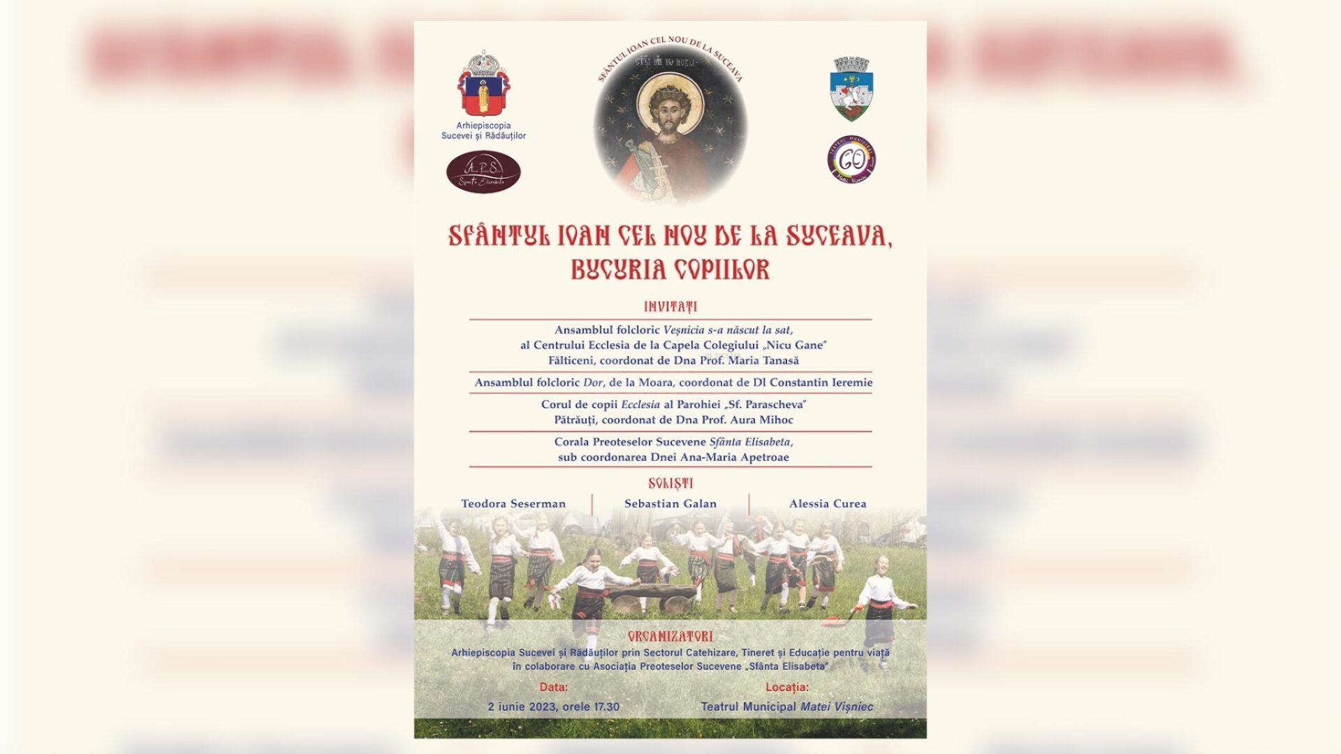 Pe scena Teatrului Municipal „Matei Vișniec” Suceava va avea loc vineri, 2 iunie, de la ora 17:30, spectacolul „Sf. Ioan cel Nou de la Suceava, bucuria copiilor”, organizat de Arhiepiscopia Sucevei și Rădăuților – Sectorul Catehizare,tineret și educație pentru viață, în colaborare cu Asociația Preoteselor Sucevene „Sf. Elisabeta”.