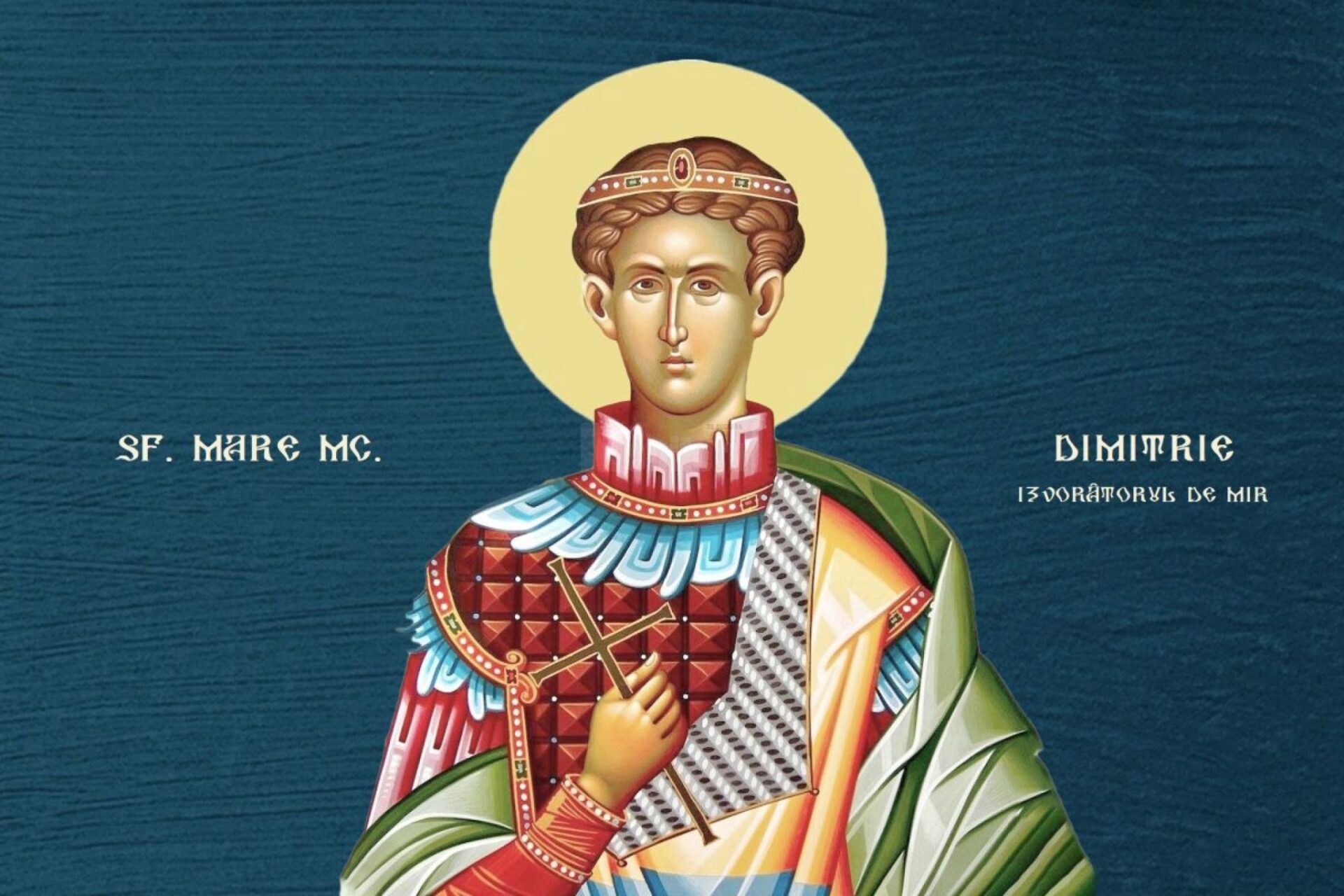 Sfântul Mare Mucenic Dimitrie (†303) a trăit pe vremea împăraților Dioclețian (284-305) și Maximian Galeriu (293-311) și era fiul dregătorului cetății Tesalonic. Părinții săi l-au botezat pe ascuns de frica prigoanelor și îl învățau tainele sfintei credințe creștine. Și așa, Dimitrie a cunoscut adevărul din cuvintele părinților săi, dar mai ales a început a lucra în el harul lui Dumnezeu. După moartea tatălui său, Sfântul Dimitrie a ajuns dregător în locul lui, cârmuind cu multă vrednicie poporul și propovăduind pe față credința în Hristos-Domnul. Întorcându-se biruitor dintr-un război cu sciții, Maximian a poruncit să se facă praznic în fiecare cetate în cinstea zeilor. Sfântul Dimitrie a mărturisit atunci că este creștin și pentru aceasta a fost întemnițat. În timpul jocurilor în cinstea împăratului, un luptător, Lie, vandal de neam, se lupta cu cei viteji și-i ucidea, aruncându-i în sulițe, mai ales pe creștini. Atunci, tânărul Nestor a cerut binecuvântarea Sfântului Dimitrie să lupte cu Lie, și însemnându-l cu semnul Crucii pe frunte, Nestor l-a biruit pe acela. Înainte de luptă Nestor a strigat cu glas mare: „Dumnezeul lui Dimitrie, ajută-mi!” Apoi a început să se lupte cu potrivnicul, pe care, trântindu-l jos în sulițele cele ascuțite, l-a omorât. Împăratul s-a mâhnit foarte tare de pierderea lui Lie, mai mult decât dacă ar fi căzut el din împărăția sa. Chemând la el pe Nestor, i-a zis: „Tânărule, cu ce farmece l-ai biruit pe Lie? El a omorât atâția oameni mai puternici decât tine și tu cum l-ai omorât pe dânsul?” Nestor a răspuns: „Împărate, eu nu am biruit pe Lie cu farmece, ci cu puterea lui Hristos, adevăratul Dumnezeu, am făcut aceasta”. Păgânul împărat s-a mâniat foarte tare și a poruncit unui boier pe care îl chema Marchian să-l scoată pe Nestor afară de poarta cea de aur și să-i taie capul cu cuțitul. În acest chip s-a sfârșit Sfântul Nestor, după cuvântul Sfântului Dimitrie. Maximian aflând că Sfântul Dimitrie l-a îndemnat pe Nestor să lupte, trimițând ostași, l-au străpuns cu sulițele. „Precum Lie a fost aruncat în sulițe de Nestor și a murit, așa și Dimitrie să fie străpuns cu sulițele, ca de aceeași moarte să moară cel care a pricinuit moartea iubitului meu Lie”, așa zicea împăratul. Dar s-a înșelat nebunul împărat socotind că sfinții mor cu aceeași moarte ca și păcătoșii, pentru că moartea păcătoșilor este cumplită, iar a sfinților este cinstită înaintea Domnului.