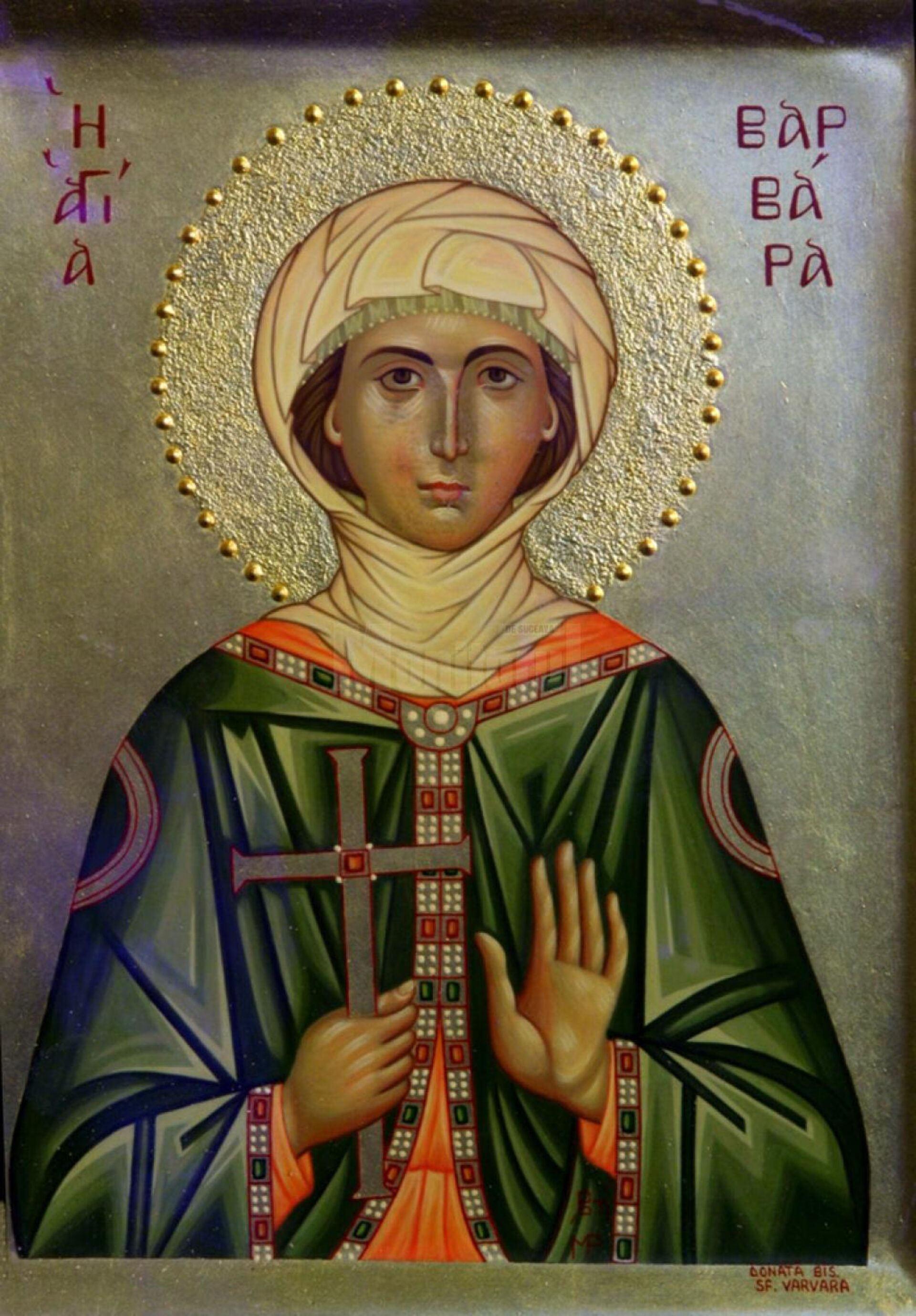Sfânta Mare Muceniță Varvara a trăit pe vremea împăratului păgân Maximian. Cetatea Heliopolis din Egipt a fost patria sa. Rămasă orfană de mică, copila Varvara a fost crescută de tatăl păgân pe nume Dioscor. Varvara era frumoasă și tatăl considera că nimeni nu e vrednic să vadă frumusețea ei. A construit un turn mare și i-a amenajat casă frumoasă fiicei sale pentru a nu lua contact cu lumea din jur. Au venit la vremea potrivită tineri bogați și frumoși ca s-o ia pe Varvara de soție, dar tânăra i-a refuzat.