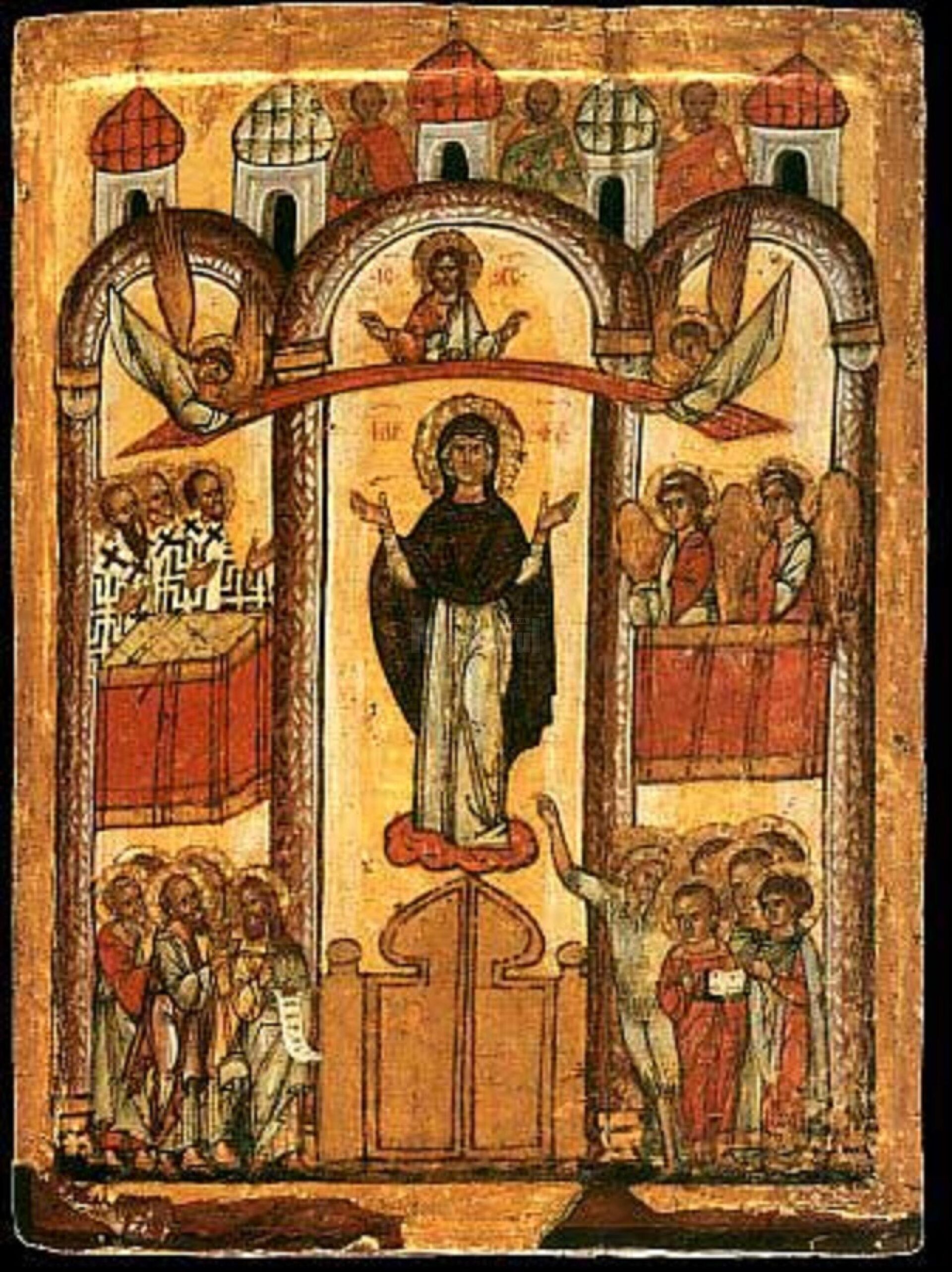 Însemnările din istoria creștinismului rus ne înfățișează această realitate în mod concret: încă din secolul al XII-lea a fost zidită o biserică purtând acest hram, cunoscută astăzi sub numele de Catedrala Acoperământului (de pe râul Nerl, din localitatea Bogoliubovo, Rusia), inclusă actualmente în patrimoniul mondial UNESCO. Ctitorul măreței zidiri, cneazul de Vladimir și Suzdal, Andrei Bogoliubov, primind ajutorul miraculos al Maicii Domnului într-un război cu tătarii, s-a hotărât să aducă astfel preacinstire protectoarei sale. Ba mai mult, tot el a compus slujba Acoperământului, dar și acatistul. Deoarece a apărat Ortodoxia cu prețul vieții sale, Biserica Rusă l-a trecut pe evlaviosul prinț în rândul sfinților, pomenindu-l în fiecare an pe 4 iulie.