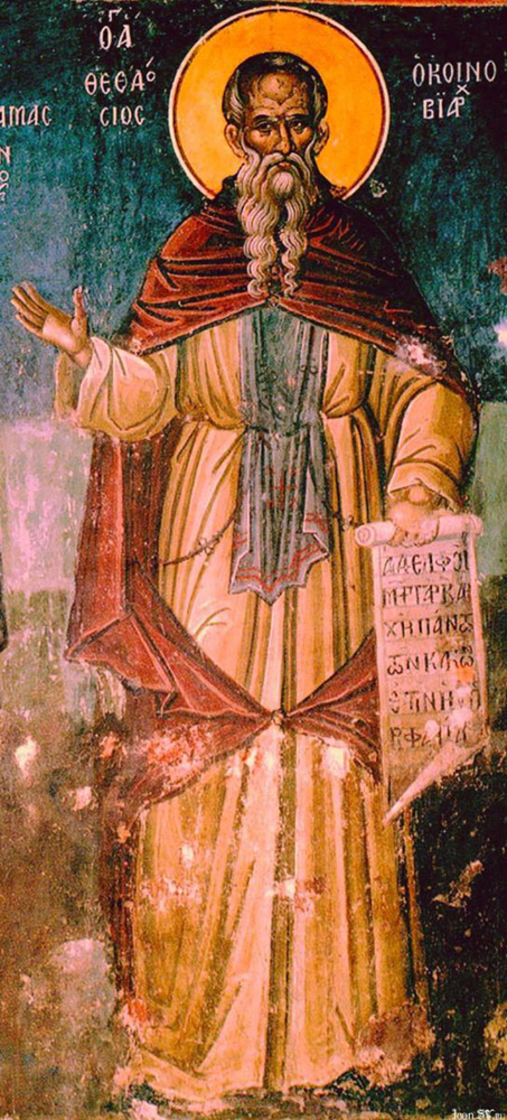 Începătorul vieții de obște, Sfântul Teodosie s-a născut în Capadocia și a primit cu mult drag cuvintele Sfintei Scripturi, citindu-le în Biserică oamenilor și dorind să le urmeze. A renunțat la oricare alte planuri și, călăuzit de Dumnezeu, a mers la Sfântul Simeon Stâlpnicul, în Antiohia, pentru a lua binecuvântare. Acolo Sfântul Simeon, înainte-văzător, i-a prorocit că va ajunge să îndrume multe persoane, luptând contra diavolului. Apoi, Sfântul Teodosie a mers în cetatea Ierusalimului și a devenit ucenic al părintelui Longhin, cunoscut la acea vreme ca fiind printre cei mai iscusiți stareți. Dar pentru că roadele sale bune au ajuns la urechile oamenilor și nu mai avea pace, Sfântul Teodosie a plecat în munți și s-a sălășluit într-o peșteră. S-a dovedit apoi că mutarea lui a fost făcută după voia dumnezeiască, pentru că în acel loc s-a construit binecunoscuta lavră unde Domnul a adunat cete duhovnicești.