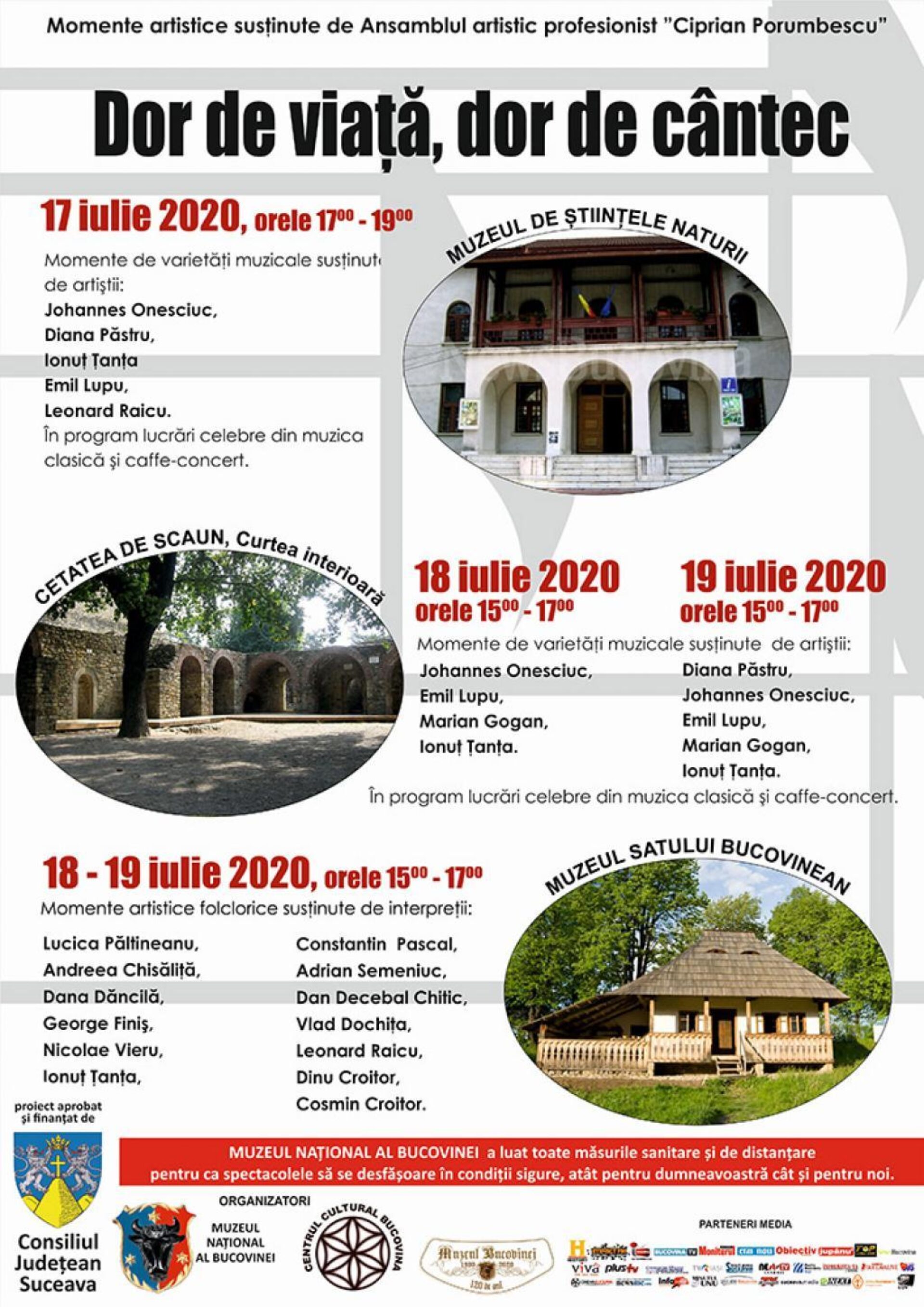 Tot în acest weekend, între orele 15:00-17:00, la Muzeul Satului Bucovinean, interpreții Lucica Păltineanu, Constantin Pascal, Andreea Chisăliță, Adrian Semeniuc, Dana Dăncilă, Dan Decebal Chitic, George Finiș, Vlad Dochița, Nicolae Vieru, Leonard Raicu, Ionuț Țanța, Dinu Croitor și Cosmin Croitor vor interpreta piese folclorice. Muzeul Național al Bucovinei a luat toate măsurile sanitare și de distanțare pentru ca spectacolele să se desfășoare în condiții de siguranță, atât pentru publicul vizitator, pentru artiștii care susțin spectacolele, cât și pentru angajații muzeului. Proiectul se va derula la fiecare sfârșit de săptămână din luna iulie.