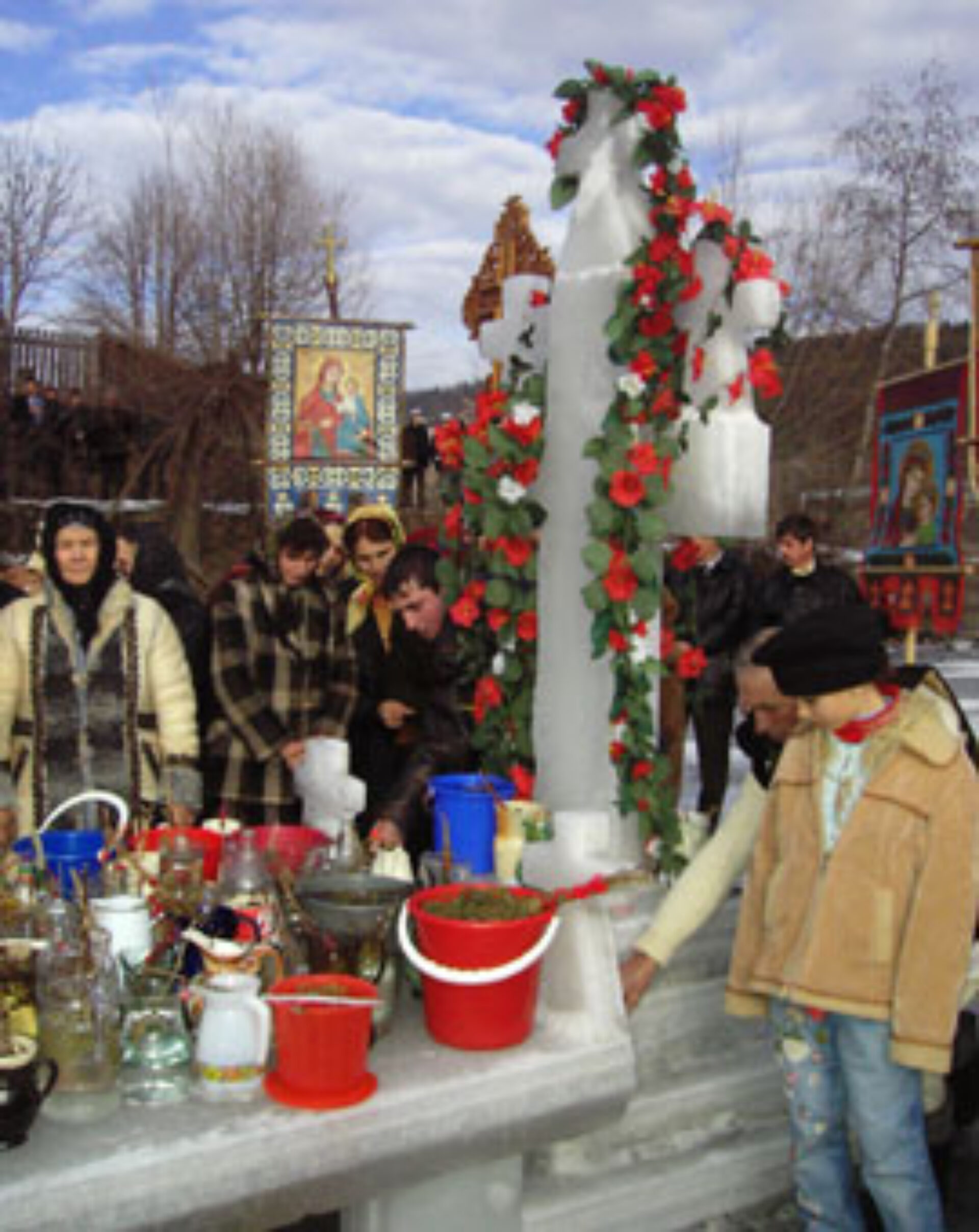 Fiecare credincioasă și-a așezat vasul pentru agheasmă pe masa de gheață, construită în continuarea Sfintei Cruci, și a așteptat începerea slujbei religioase de sfințire a apelor.