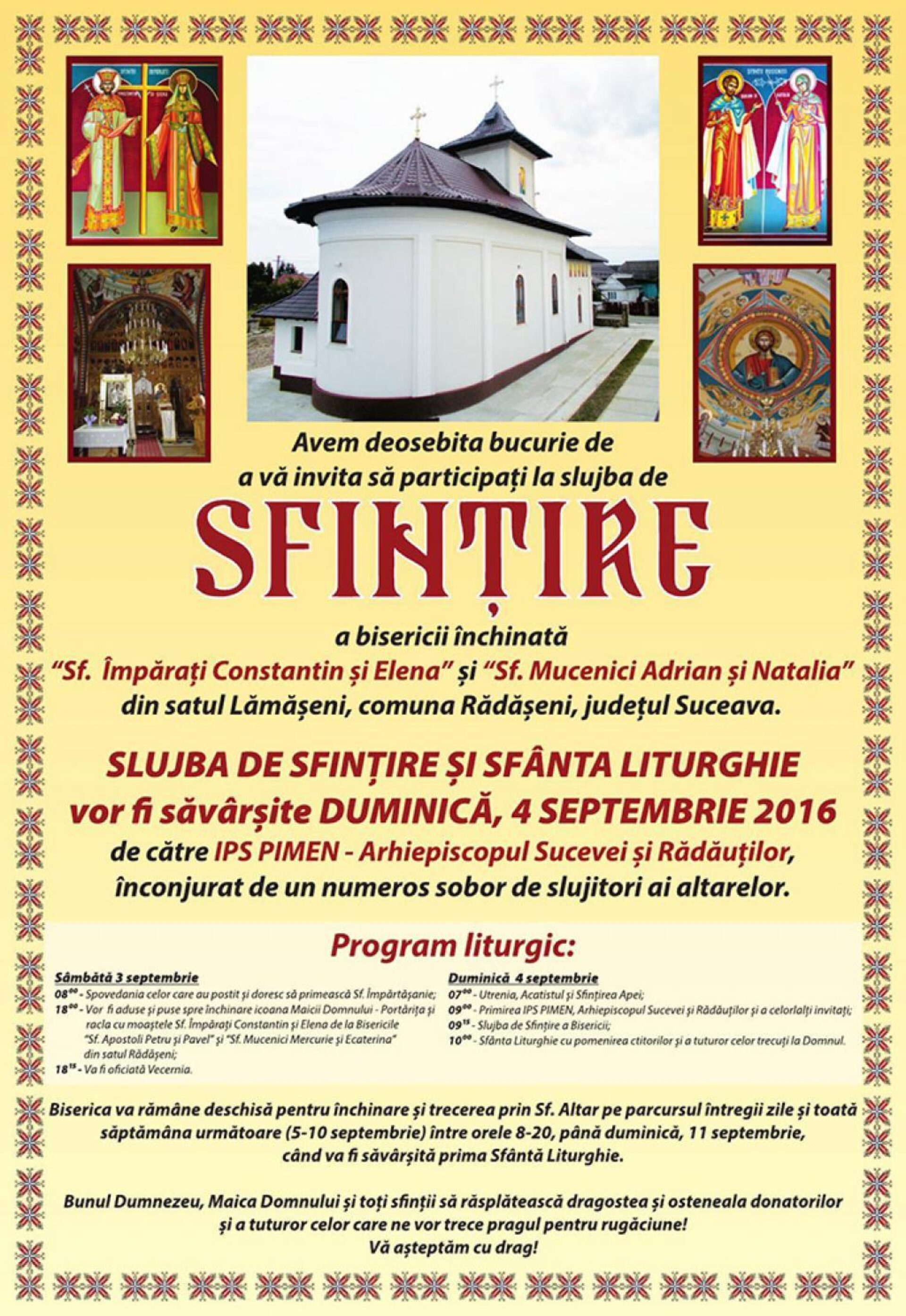 Avem deosebita bucurie de a vă invita să participați la slujba de sfințire a bisericii închinate „Sf. Împărați Constantin și Elena” și „Sf. Mucenici Adrian și Natalia” din satul Lămășeni, comuna Rădășeni. Slujba de sfințire și Sfânta Liturghie vor fi săvârșite duminică, 4 septembrie, de către ÎPS Pimen, Arhiepiscopul Sucevei și Rădăuților, înconjurat de un numeros sobor de slujitori ai altarelor. Duminică, 4 septembrie, la ora 7:00, se vor face Utrenia, Acatistul și Sfințirea Apei, la ora 9:00, primirea IPS Pimen, Arhiepiscopul Sucevei și Rădăuților, și a celorlalți invitați, urmând ca la ora 9:15 să înceapă slujba de sfințire a bisericii. La ora 10:00 va începe Sf. Liturghie cu pomenirea ctitorilor și a tuturor celor trecuți la Domnul. Biserica va rămâne deschisă pentru închinare și trecere prin Sf. Altar pe parcursul întregii zile de 4 septembrie și toată săptămâna următoare (5 – 10 septembrie), până duminică, 11 septembrie, când va fi săvârșită prima Sf. Liturghie. Bunul Dumnezeu, Maica Domnului și toți sfinții să răsplătească dragostea și osteneala donatorilor și a tuturor celor care ne vor trece pragul pentru rugăciune. (Pr. Adrian Pintilie)