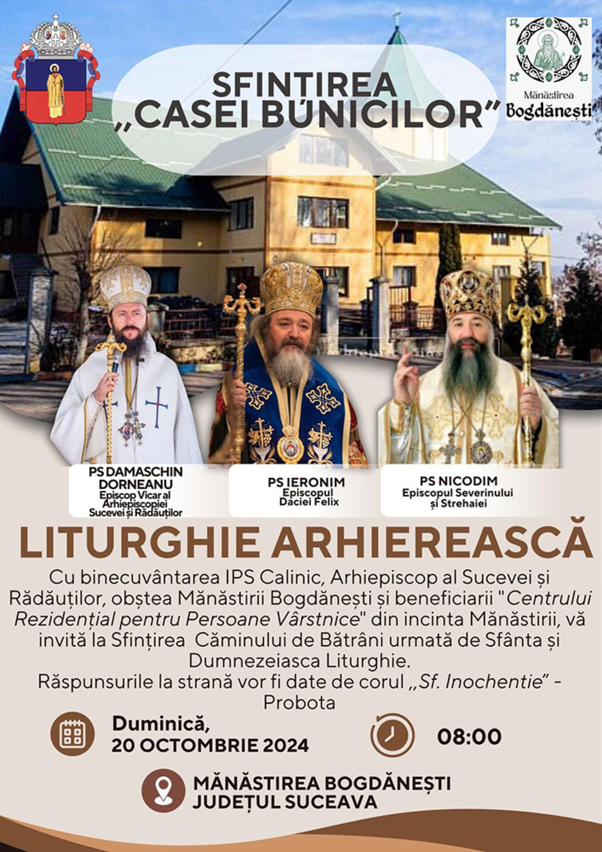Cu binecuvântarea Înaltpreasfințitului Părinte Calinic, Arhiepiscopul Sucevei și Rădăuților, Mănăstirea Bogdănești găzduiește un eveniment de mare importanță pentru întreaga comunitate, pe data de 20 octombrie 2024, începând cu ora 08:00: sfințirea „Casei Bunicilor”, noul cămin destinat persoanelor vârstnice, recent reamenajat în incinta așezământului monahal.