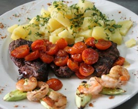 Mușchiul de vită se frige pe grătar împreună cu creveții și prazul. Roșiile chery se trag în tigaie și se adaugă zahăr și condimente. Se așează totul pe farfurie, iar peste mușchiul de vită se pune sosul italian.