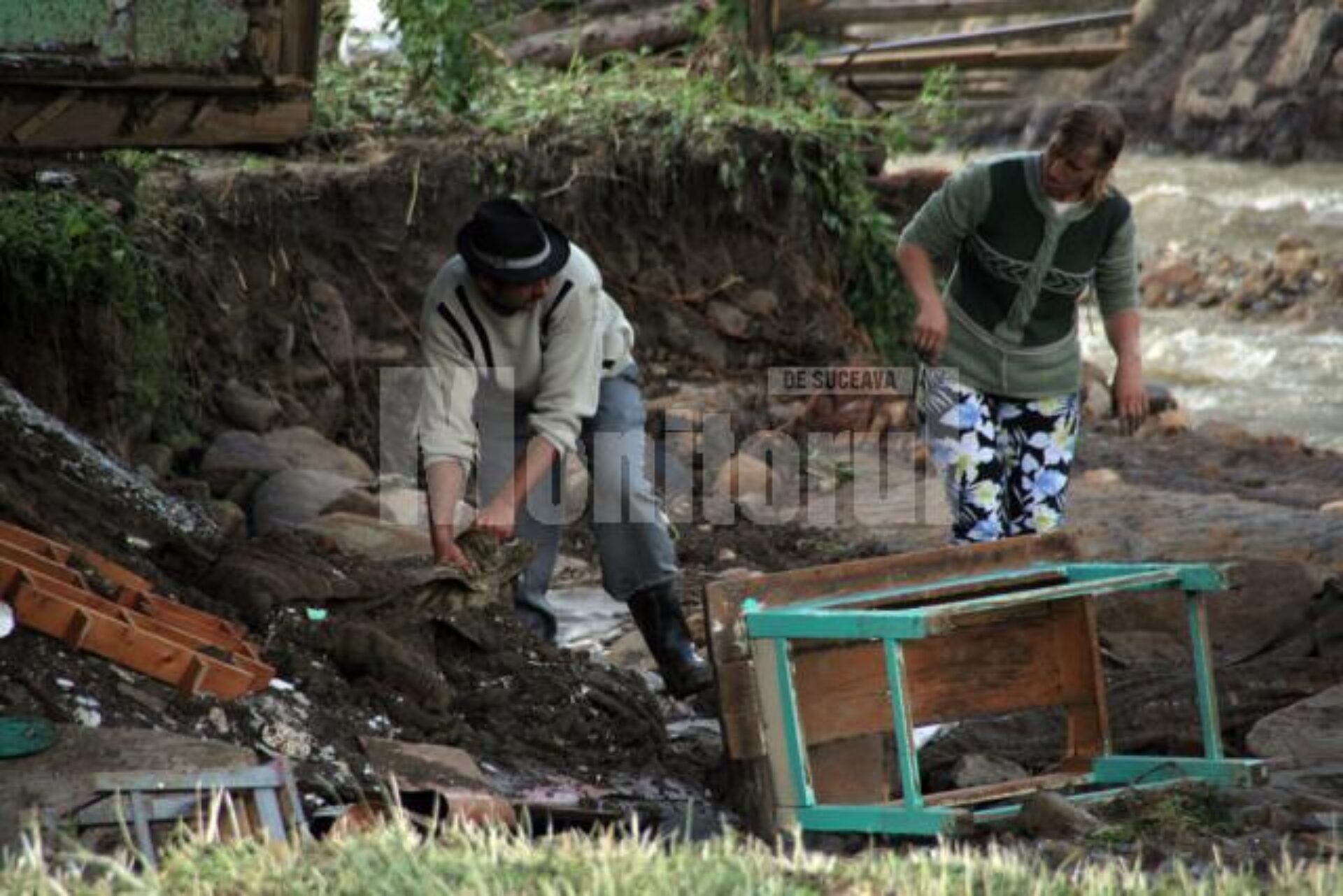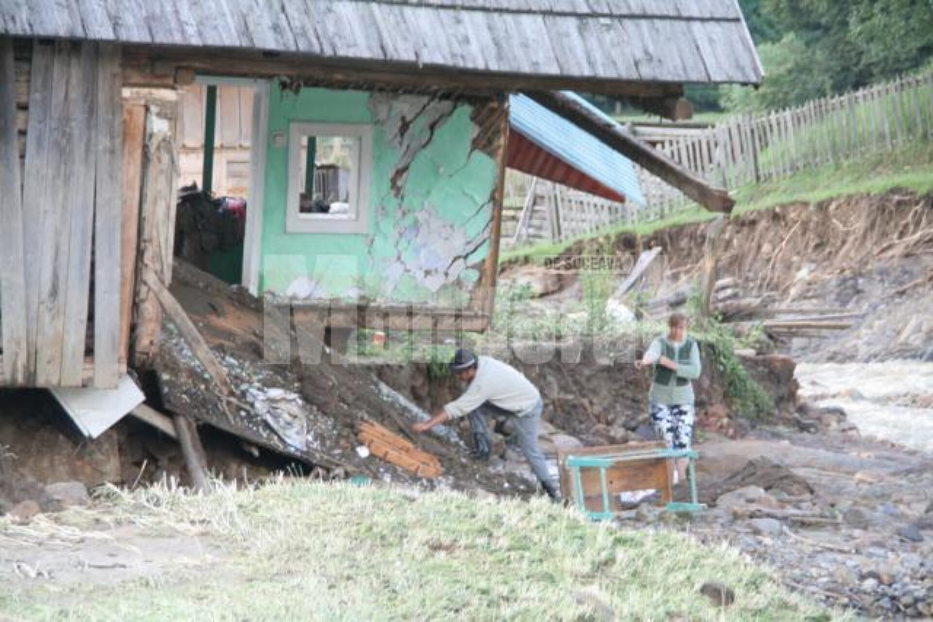 Cinci familii din comuna Moldovița au rămas fără locuințe, inundațiile de la sfârșitul săptămânii trecute distrugându-le în totalitate casele. În doar o jumătate de oră, viitura de pe râul Moldovița a adus dezastrul în casele a peste 200 de familii din această comună, care s-au trezit că au rămas fără agoniseala dintr-o viață. Oamenii din Moldovița povestesc că asemenea inundații nu au mai lovit comuna de aproape 60 de ani și că pagubele înregistrate nu au fost niciodată atât de mari. „Suntem nenorociți. Nu mai știm ce să facem. Dintr-o dată ne-am trezit cu puhoiul în casă și de abia am avut timp să ne salvăm”, ne povestește Liliana Butnatriu, care, deși are casa în picioare, nu mai poate folosi nimic din lucrurile pe care le avea în locuință. Dezastrul prin care au trecut locuitorii acestei comune se poate vedea și la două zile de la inundații, sute de case fiind încă pline de nămolul adus de apele pârâului Moldovița. „În mod normal apa pârâului nu este mare. Dar sâmbătă a venit ca un perete de apă și nu am mai putut să facem nimic. Am scos ce s-a putut din casă, însă apa a fost prea mare ca să putem salva ceva. Acum apa a scăzut, dar nămolul și bucăți de lemn și de scânduri au rămas în continuare în casă și în curte. Nu mai știm ce să facem și când o să putem să ne mutăm înapoi în casă”, spune femeia având ochii în lacrimi.