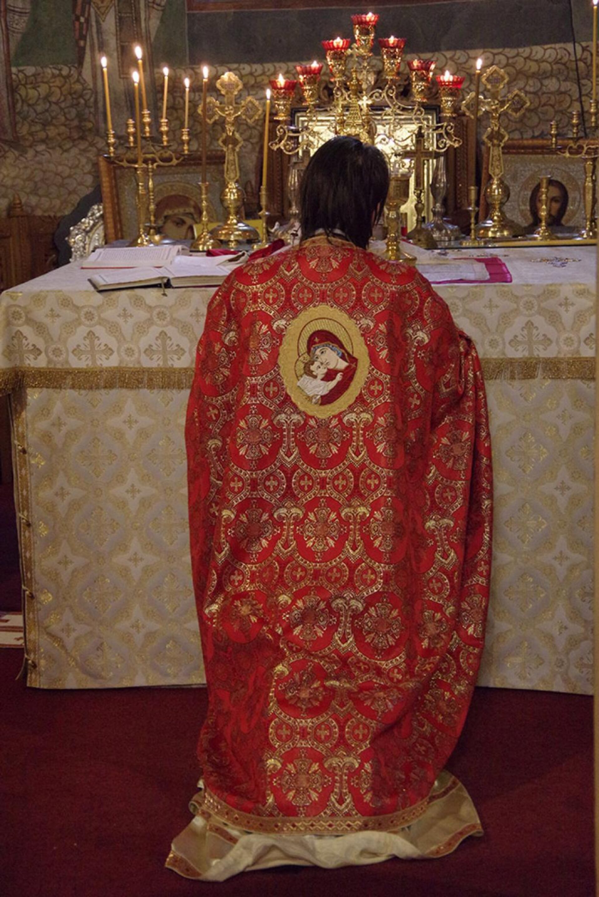 [Hristos, simbolizat de marele preot,] este simbolizat și de Sfânta Evanghelie, care se vede pe Sfânta Masă, și prin Crucea care-I arată jertfa. Dedesubtul Sfintei Mese se pun sfintele moaște ale mucenicilor, cei ce sunt pururea în duh alături de Hristos, Marele Mucenic al Tatălui. Sfânta Masă stă deasupra lor și fiindcă ei sunt temelia Bisericii; deoarece Biserica a fost întemeiată prin sângele lui Hristos, în primul rând, dar și prin sângele acelora care au primit mucenicia pentru numele Lui.