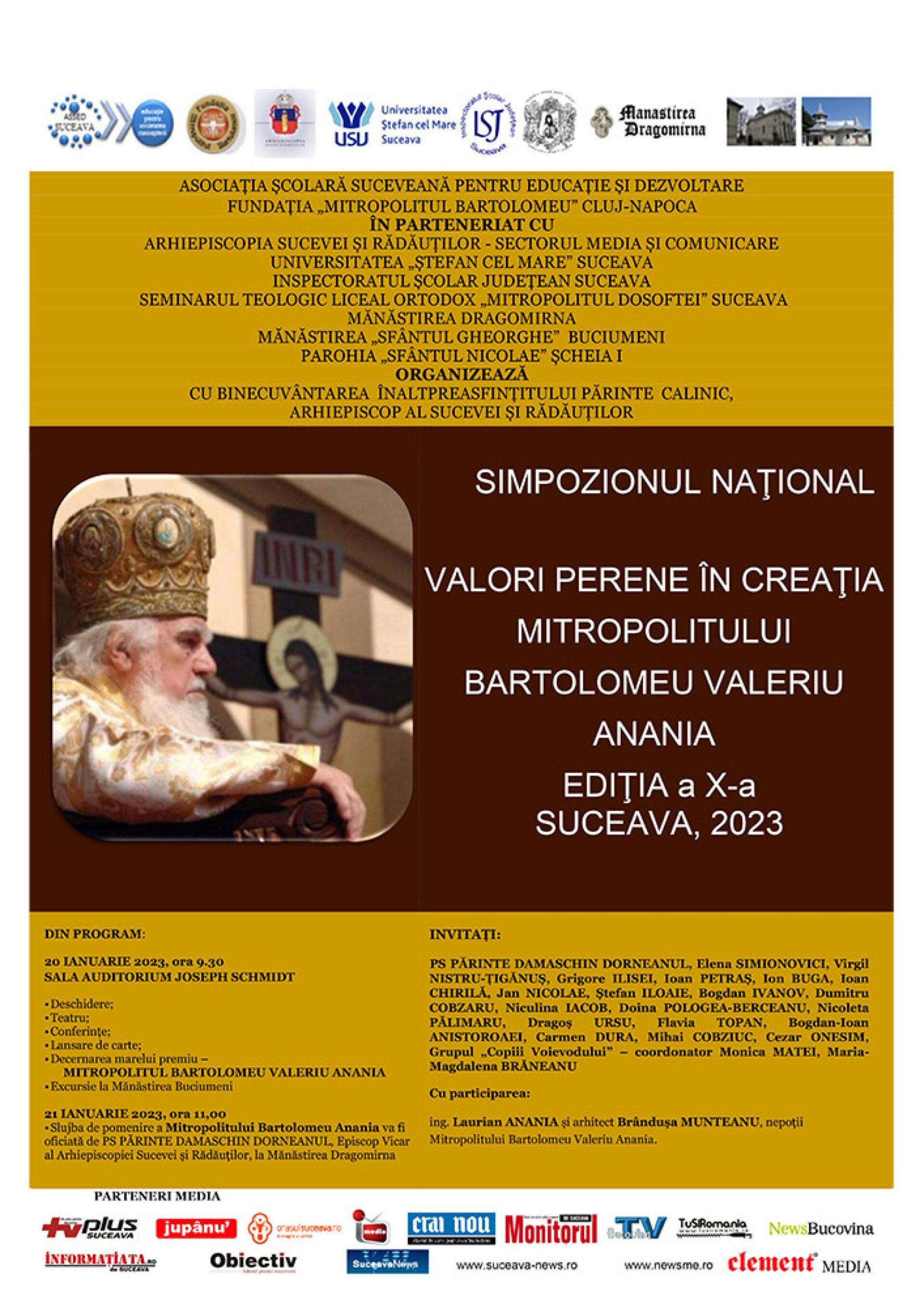 Lucrările celei de a X-a ediții a simpozionului național ”Valori perene în creația Mitropolitului Bartolomeu Valeriu Anania” se vor desfășura în cursul zilei de vineri, 20 ianuarie, la Universitatea ”Ștefan cel Mare” din Suceava, în sala Auditorium Joseph Schmidt, începând cu ora 09.30. O excursie la Mănăstirea Buciumeni va destinde atmosfera după-amiază și o slujbă de pomenire a marelui mitropolit la Mănăstirea Dragomirna va avea loc în cursul zilei de sâmbătă, oficiată fiind de PS Părintele Damaschin Dorneanul, Episcop Vicar al Arhiepiscopiei Sucevei și Rădăuților.
