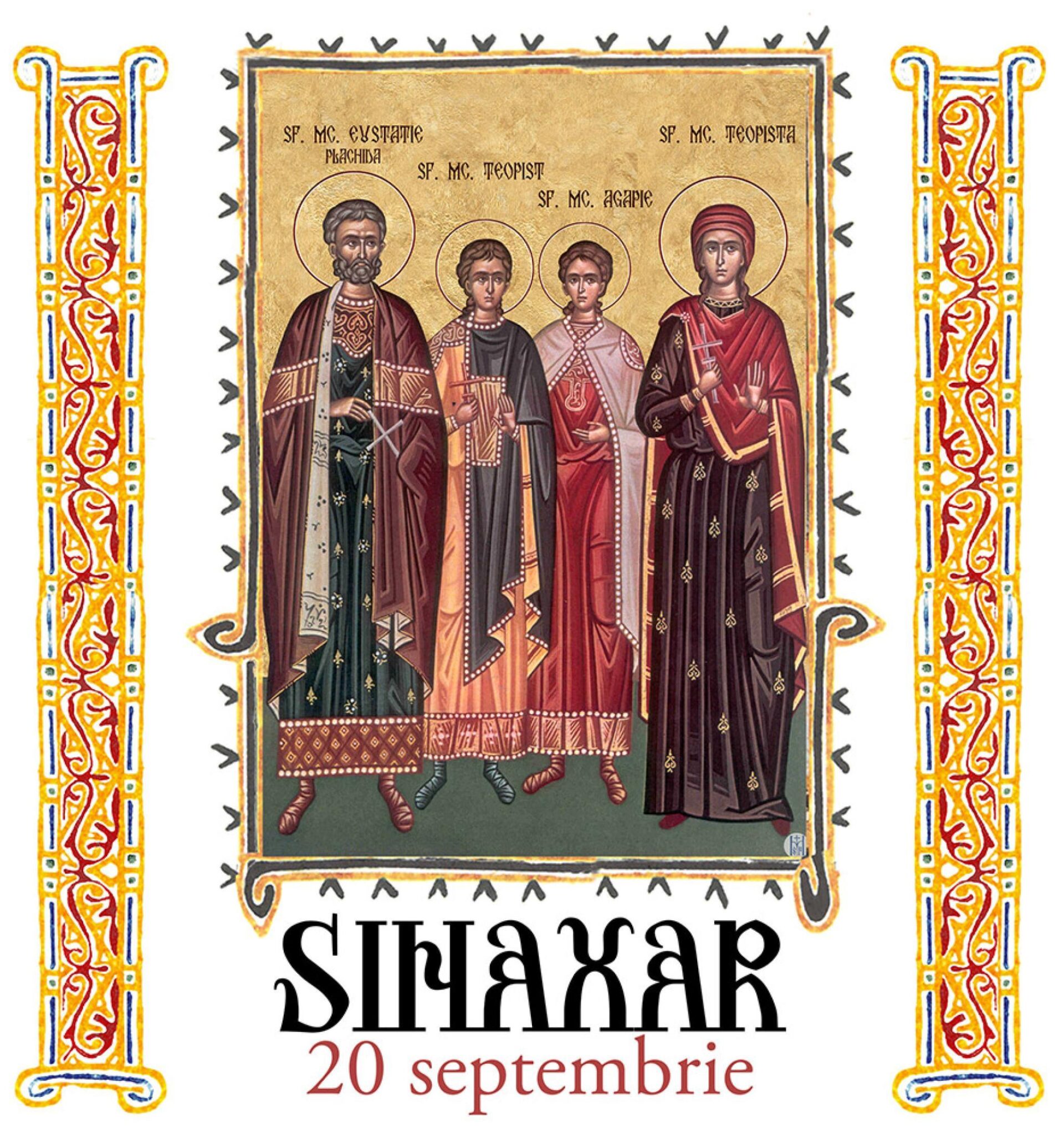 În luna septembrie, în ziua a douăzecea, facem pomenirea Sfinților Mari Mucenici: EUSTATIE Plachida și TEOPISTI, soția sa, dimpreună cu cei doi fii ai lor: AGAPIE și TEOPIST, care au pătimit la Roma în vremea împăratului Adrian (+ 118).