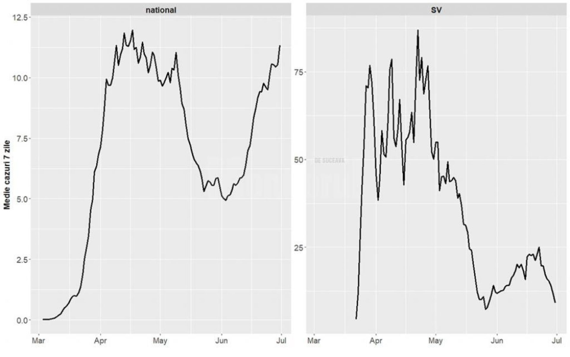 Analizând numărul de cazuri noi înregistrate la mia de locuitori în perioada 1 – 30 iunie, Suceava ocupă locul 5 cu 0,76, după Brașov cu 1,33, Vrancea cu 1,30, Argeș cu 0,91 și Buzău cu 0,89. Dacă se analizează numărul total de cazuri noi din luna iunie, Suceava este pe locul 4, cu 474 de cazuri noi în perioada 1-30 iunie, după municipiul București, care are 1126 cazuri noi, județul Brașov, cu 732, și județul Argeș, cu 530 cazuri noi în aceeași perioadă, în ambele clasamente județul Suceava coborând cu o poziție față de situația publicată anterior pentru perioada 1-27 iunie. Distribuția numărului de cazuri noi COVID-19 la mia de locuitori pentru perioada 1-30 iunie este reprezentată pe harta de mai jos pentru fiecare județ din România, prin prelucrarea datelor oficiale publicate de Grupul de Comunicare Strategică, pe www.mai.gov.ro.