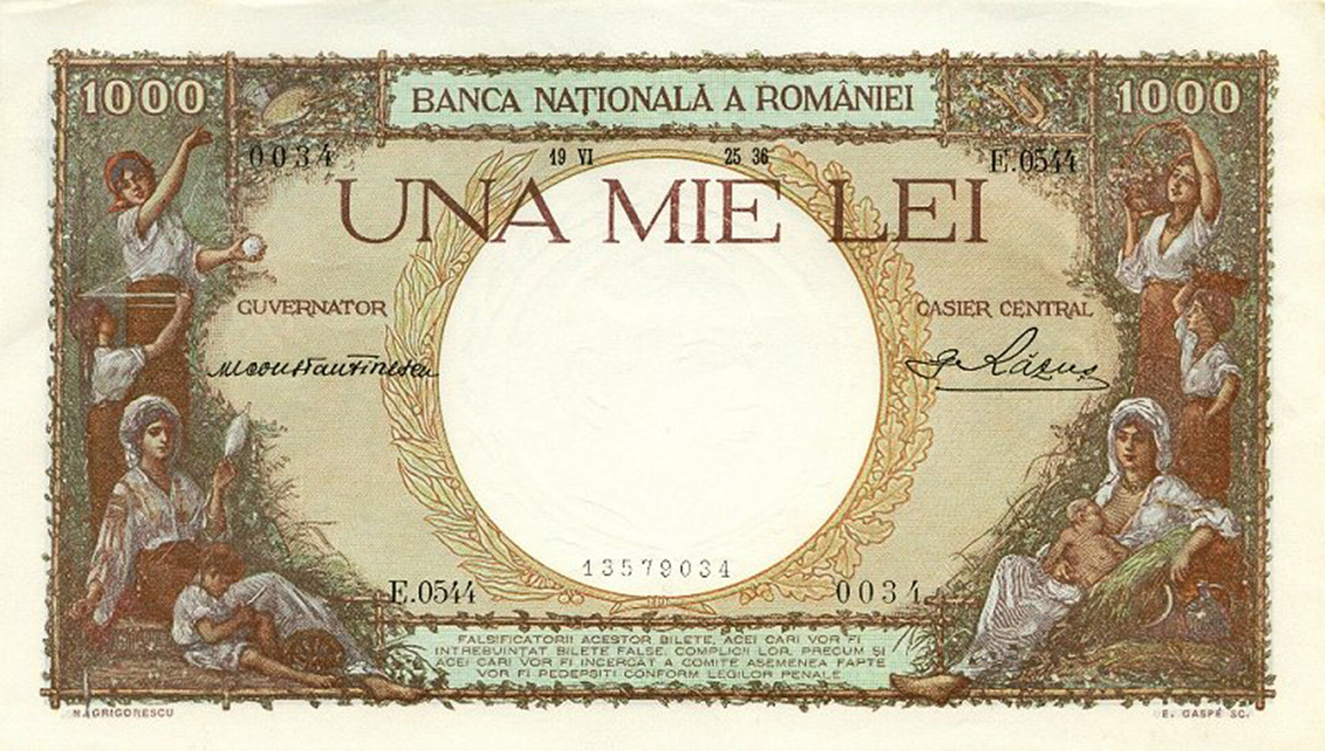 „În urma acordului intervenit între guvern şi Banca Naţională, în vederea reevaluării stocului de aur, conducerea institutului nostru de emisiune a luat hotărârea de a preschimba biletele actuale de 500 şi 1000 de lei. Noile bilete vor avea desenuri din operele marelui nostru pictor Grigorescu. Biletul de 1000 de lei, care va fi mai mic decât cel în circulaţie azi, va fi de culoare albastră, ca şi cele de 500 de lei”.
