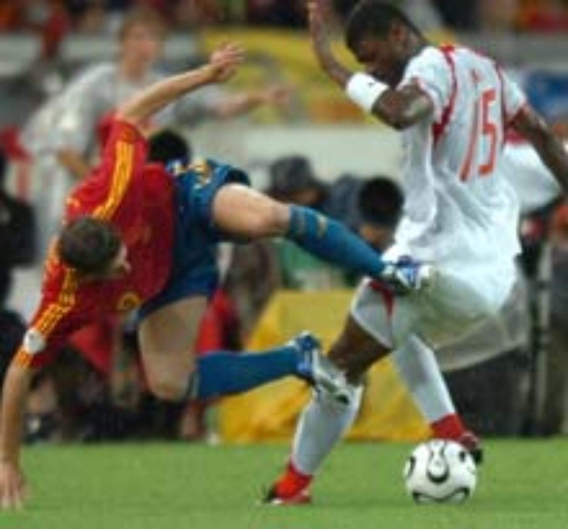 După ce a umilit Ucraina în prima partidă a grupei, Spania a fost la 18 minute de o rușine suferită în fața Tunisiei, însă Raul și Fernando Torres au salvat, in extremis, onoarea ibericilor, marcând trei goluri care i-au adus liniștea selecționerului Luis Aragones. Tunisia nu s-a mulțumit cu statutul de victimă sigură și, cu Roger Lemerre la timonă, „vulturii” au început curajos partida. Prima mare ocazie a aparținut însă spaniolilor, în minutul 6, când șutul lui David Villa a lovit plasa laterală. Bomba a căzut în minutul 8: Jaziri a pătruns în careu pe dreapta, i-a pasat în centru lui Mnari al cărui șut a fost respins în primă instanță de Casillas. Mingea a revenit la Mnari, care nu a mai ratat deschiderea scorului. Totul părea a fi un simplu foc de paie și lumea se gândea că taurii vor transforma meciul de la Stuttgart într-o corridă cu „vulturii” lui Lemerre. Așteptările au fost confirmate numai pe jumătate căci, deși insistent, tăvălugul spaniol a fost ineficient. Spania a apelat la orice mijloace pentru a obține egalarea: în minutul 26, Fernando Torres a cerșit un penalti inexistent, însă arbitrul Carlos Simon nu s-a lăsat înduplecat. Presiunea Spaniei a crescut odată cu trecerea timpului, dar veteranul din poarta Tunisiei, Boumnijel, a fost îngerul păzitor al formației africane. Atunci când „aripile” i-au fost frânte, în minutul 45, Ayari a apărut ca din pământ și a respins de pe linia porții lovitura de cap a lui Xabi Alonso, astfel că Tunisia a intrat la pauză cu avantajul luat în minutul 8. După ce ibericii s-au dovedit neputincioși în fața porții, imediat după pauză Luis Aragones i-a trimis în teren pe Fabregas și Raul. Ostilitățile au continuat după același scenariu, cu spaniolii sufocând din ce în ce mai tare o echipă a Tunisiei care s-a retras prematur, în dorința de a păstra rezultatul. De altfel, africanii nu au mai expediat niciun șut pe spațiul porții în repriza a doua. Minutele treceau și singura întrebare era cât va mai rezista Tunisia fără să primească gol. Nu mult, căci rezervele de lux ale ibericilor au ieșit la rampă. Raul nu i-a înșelat așteptările lui Aragones și a marcat în minutul 72, când a profitat de un balon respins nefericit de Boumnijel, în urma unui șut plasat al lui Fabregas. După doar cinci minute, același Fabregas l-a angajat în adâncime pe Fernando Torres care l-a executat cu sânge rece pe naivul Bomnijel aducând Spania în avantaj. Tunisienii au avut o tresărire de orgoliu în minutul 86, dar Namouchi a ratat preluarea în careul lui Casillas. În prelungirile partidei, Yahia a comis un fault inutil în suprafața de pedeapsă asupra lui Torres, arbitrul a acordat penalti iar atacantul de la Atletico Madrid a transformat în stânga lui Boumnijel și a preluat conducerea în clasamentul golgeterilor competiției. Istoria partidei a fost scrisă de schimbările lui Aragones și de erorile lui Boumnijel, care după pauză a trecut din tabăra îngerilor în cea a demonilor. Spania a obținut cea de-a 24 victorie consecutivă în era Aragones și, totodată, biletele pentru optimile de finală ale competiției. Tunisia încă mai speră la calificare, dar pentru a o obține este obligată să învingă Ucraina lui Șevcenko în ultima etapă a grupei H, care mai programează partida Arabia Saudită – Spania, ambele jocuri urmând să se dispute vineri.