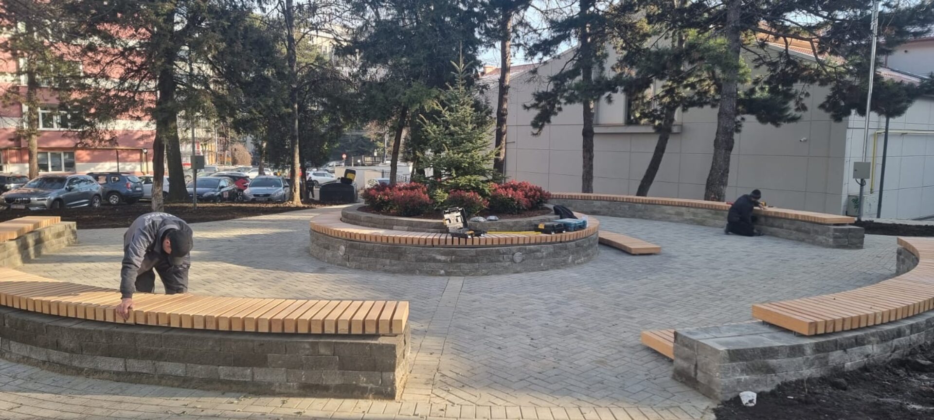 Miniparcul dintre blocuri, la care se lucrează pentru a fi finalizat anul acesta, are o componentă nouă – un rondou de flori, cu brăduț în mijloc. Lucrarea este realizată din piatră și lemn, în jurul rondoului fiind amenajată o mică piațetă, pavată, unde oamenii pot sta pe gradenele din lemn.