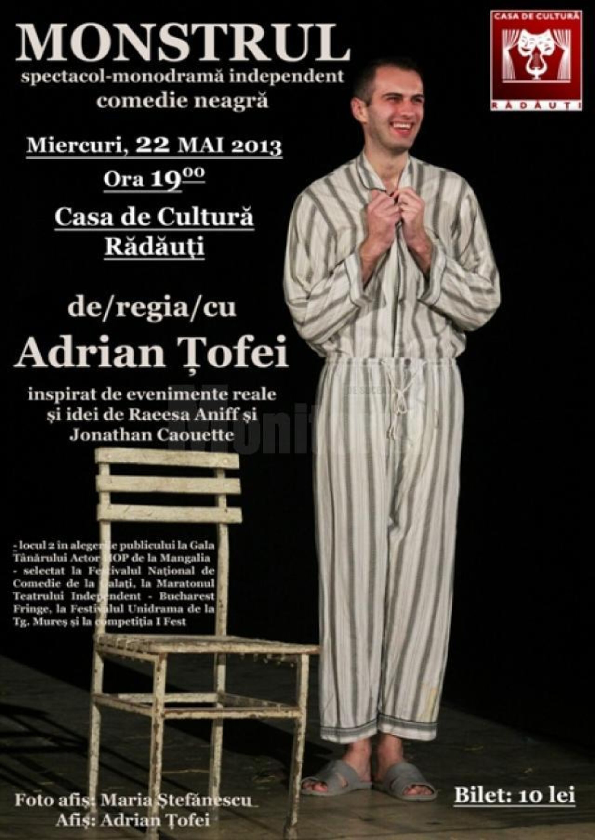 Casa de Cultură din Rădăuți prezintă miercuri, 22 mai, la ora 19.00, spectacolul-monodramă independent „Monstrul”, o comedie neagră, cu nuanțe horror, mister și tensiune de thriller psihologic, care-l are ca protagonist pe actorul Adrian Țofei, care semează regia și este și autorul textului inspirat de evenimente reale și idei de Raeesa Aniff și Jonathan Caouette.