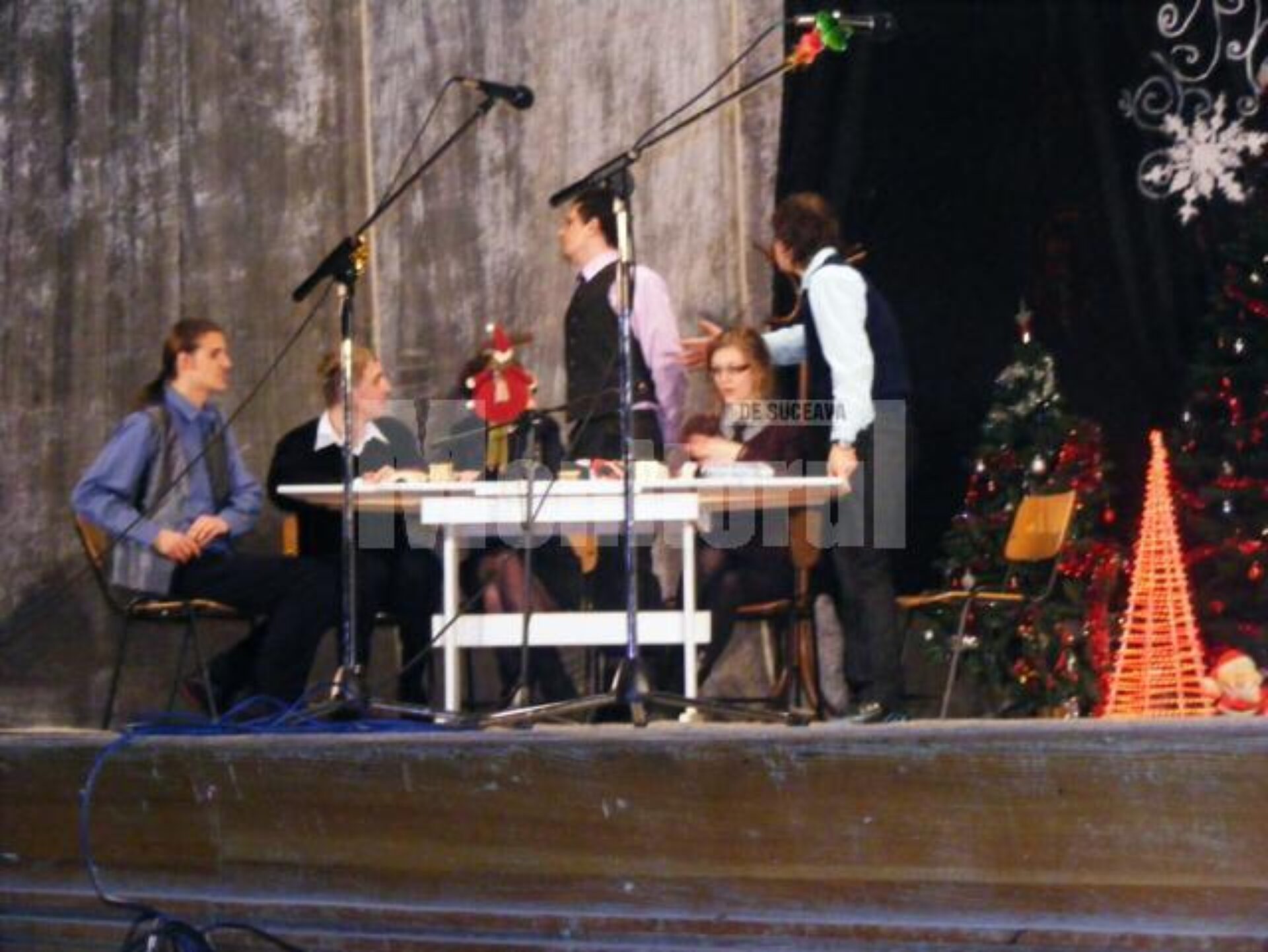 Conceput ca o poveste de Crăciun, spectacolul a debutat așa cum se cuvine, cu o selecție din cele mai frumoase colinde, interpretate de un cor condus de părintele-profesor-inspector-dirijor (ba și interpret, căci vocea sa se auzea distinct!) Gheorghe Hostiuc. Ceva mai târziu, colindele clasice de prin cele Americi au beneficiat și de versiunea germană pusă în scenă de sufletul manifestării, profesoara (și consilier educativ al Colegiului) Sofia Grigorean.
